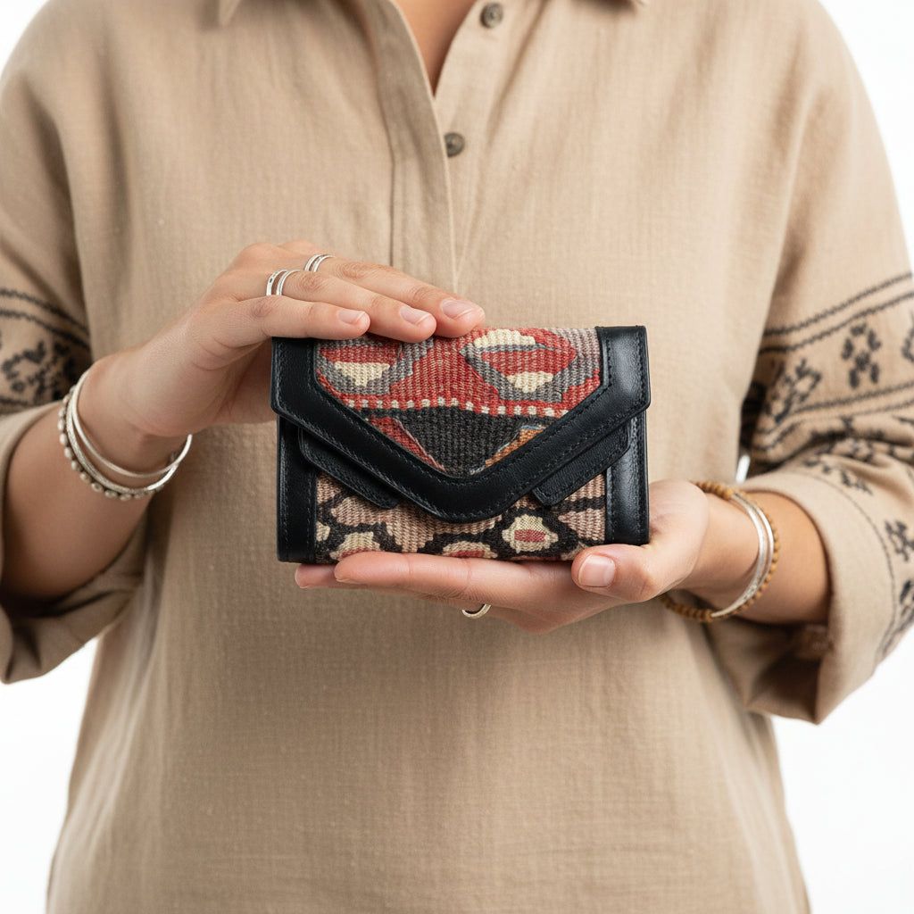 At Loom & Hide, we give these heirloom textiles a second life and purpose. Each vintage kilim is restored with care, paired with full-grain leather, and transformed into a timeless, one-of-one piece — made to be carried forward for generations.