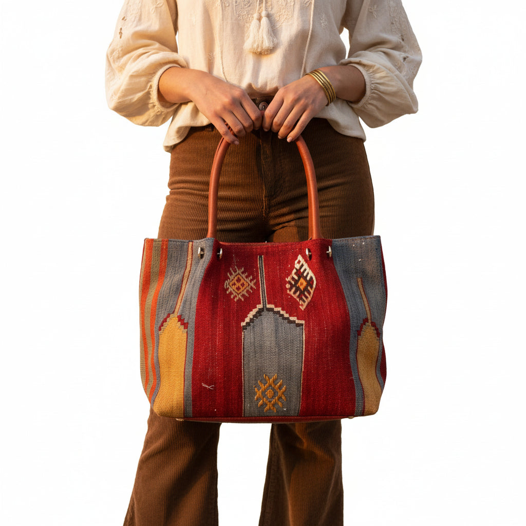 The leather reinforces high-contact areas like straps, corners, and bases, while the woven kilim remains lightweight and flexible. The result is a bag that feels soft but sturdy, able to handle daily use for years — even decades — without losing its shape or charm.