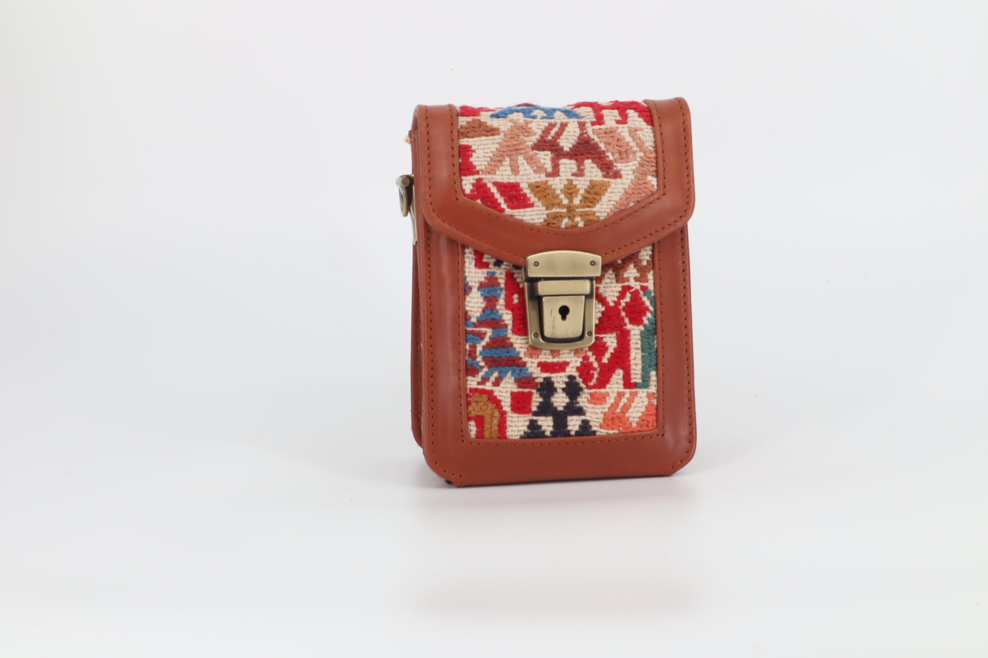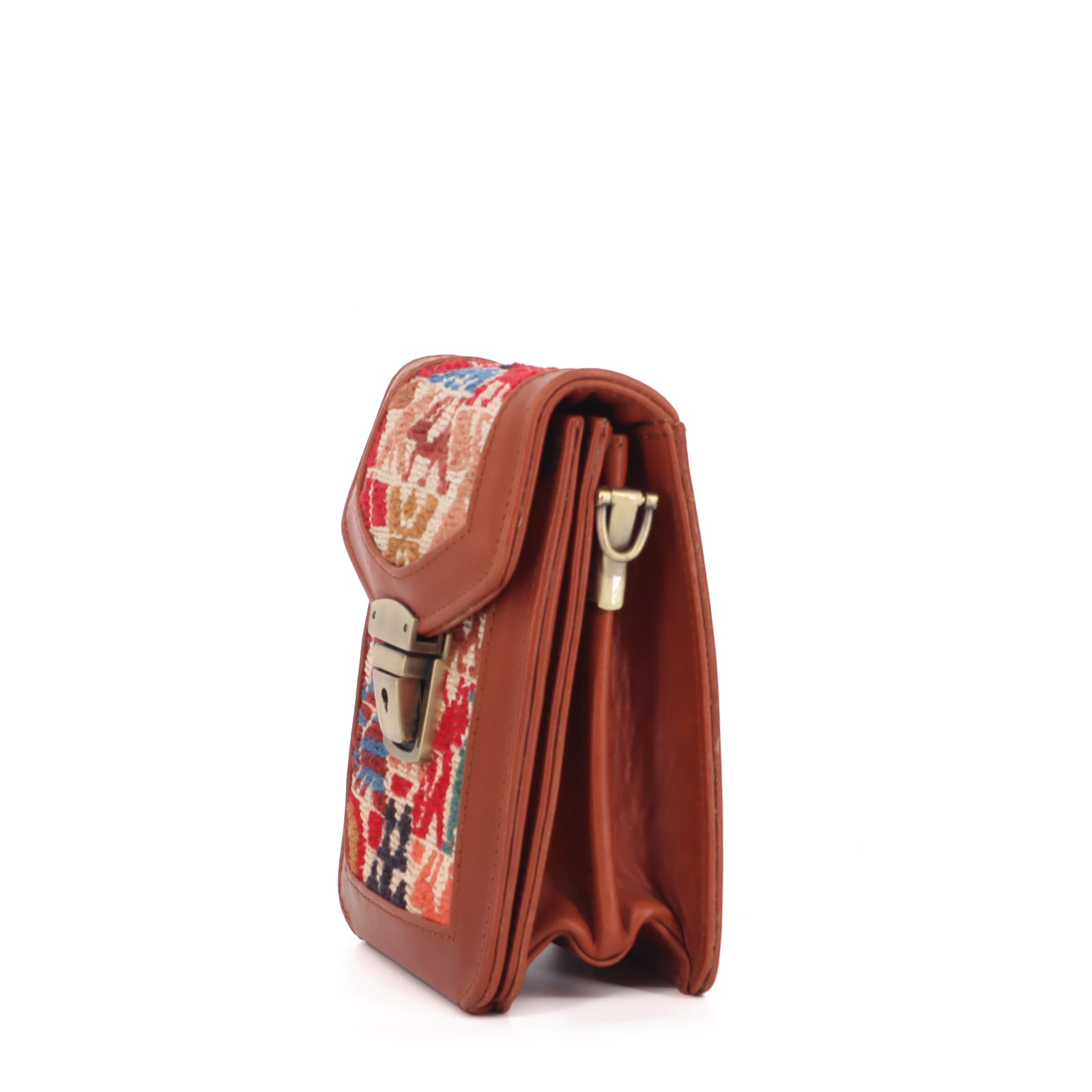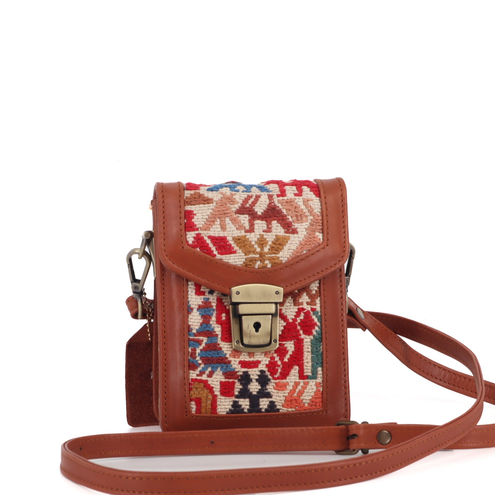 Handcrafted from a vintage Sumak rug and finished with vegetable-tanned full-grain leather, the Afra Sumak Crossbody Leather Bag is a testament to artisanal craftsmanship and timeless style. With a comfortable leather shoulder strap, secure latch closure, and sleek brass hardware, this bag epitomizes functional elegance. The cotton canvas interior, along with a leather-trimmed zip pocket, ensures your essentials are always within easy reach.