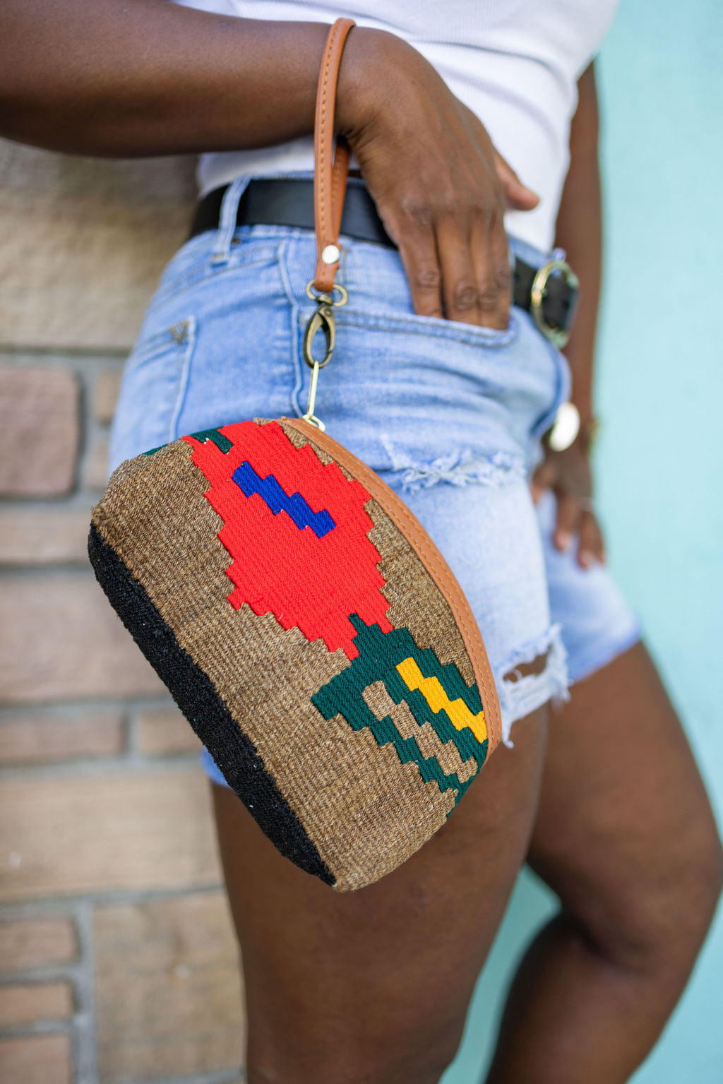 Handcrafted from a vintage kilim rug and finished with vegetable-tanned full-grain leather, this clutch wrislet exhibit a blend of traditional craftsmanship and contemporary design. The bag is adorned with a leather wrist handle. The main compartment is secured with a YKK zipper guaranteeing the safety of your belongings.