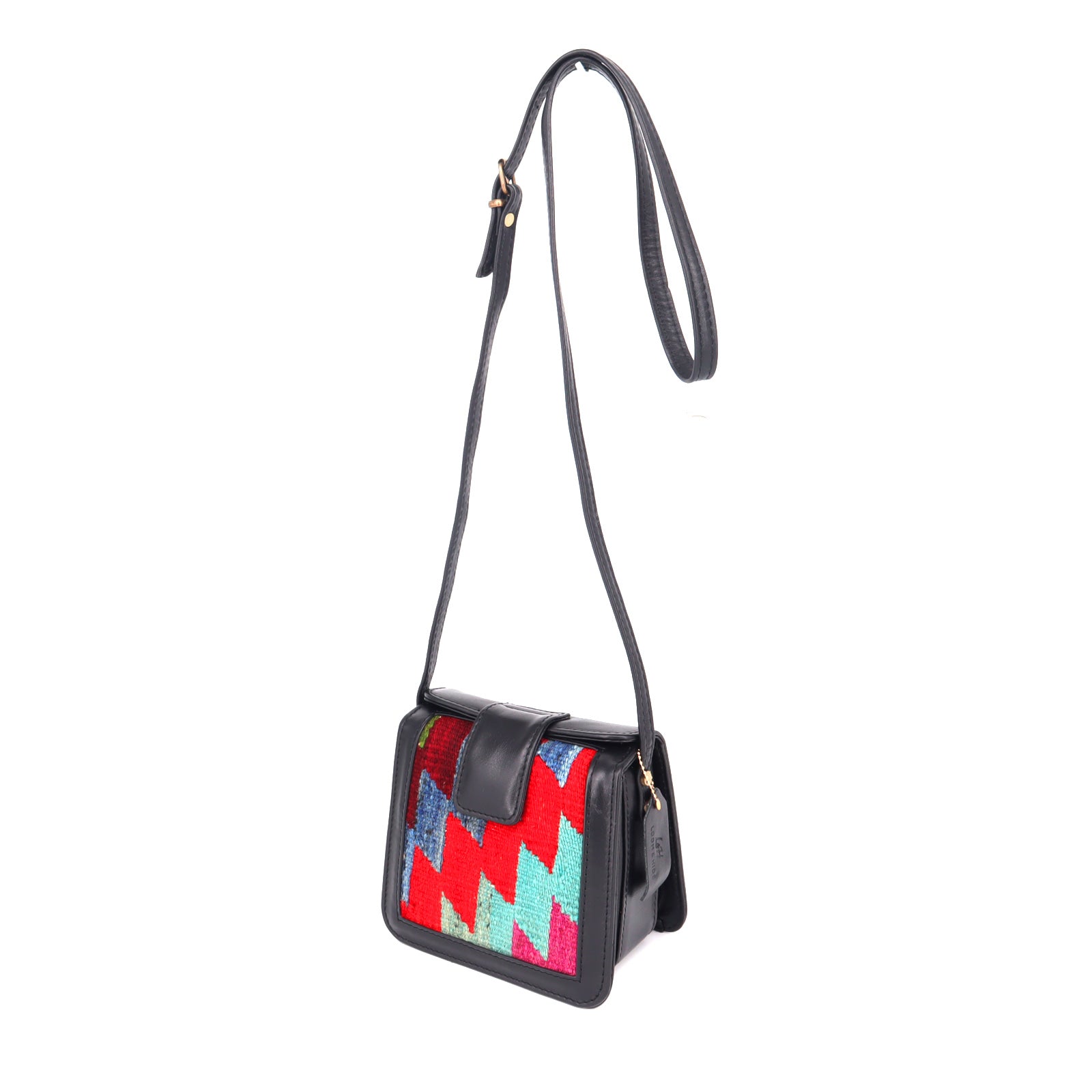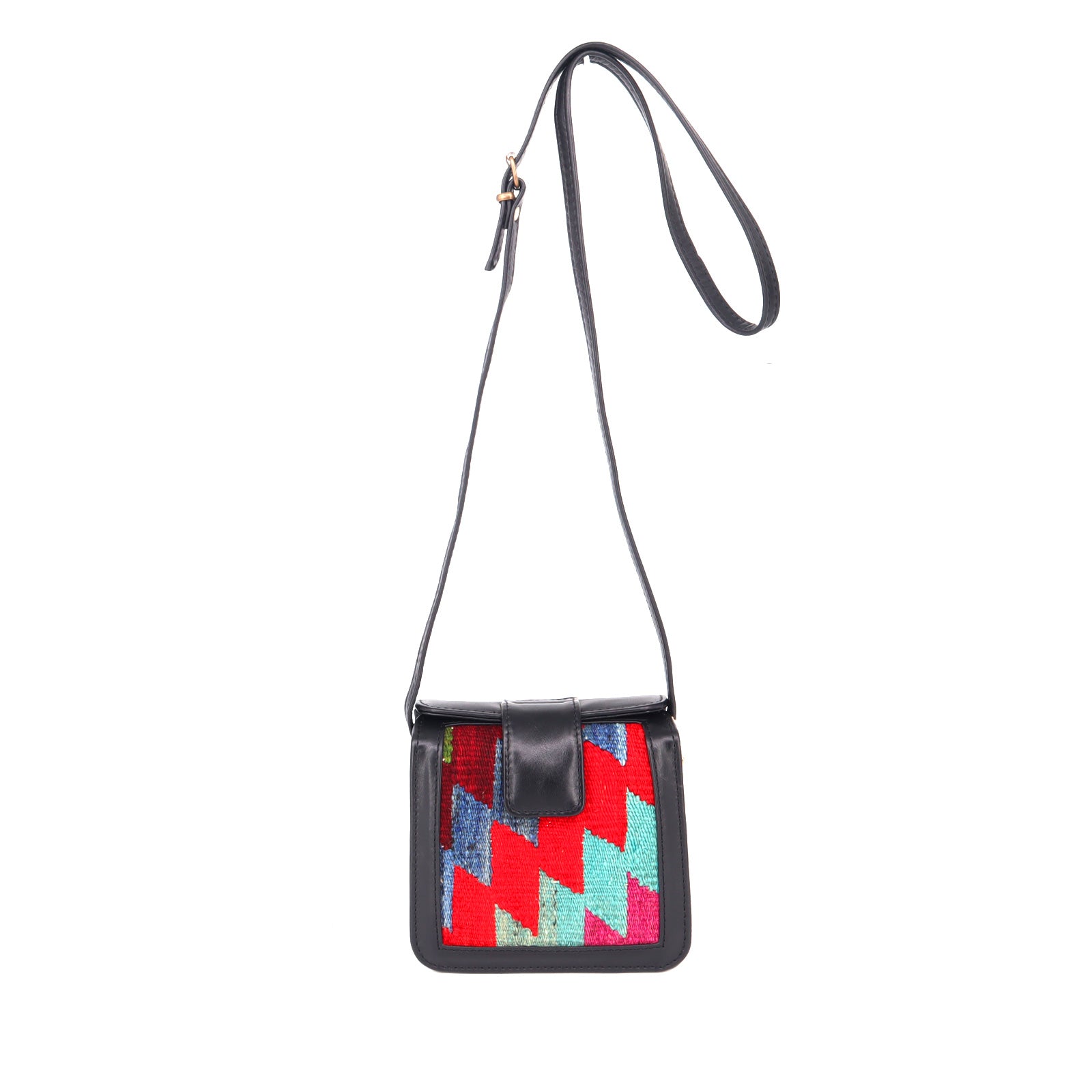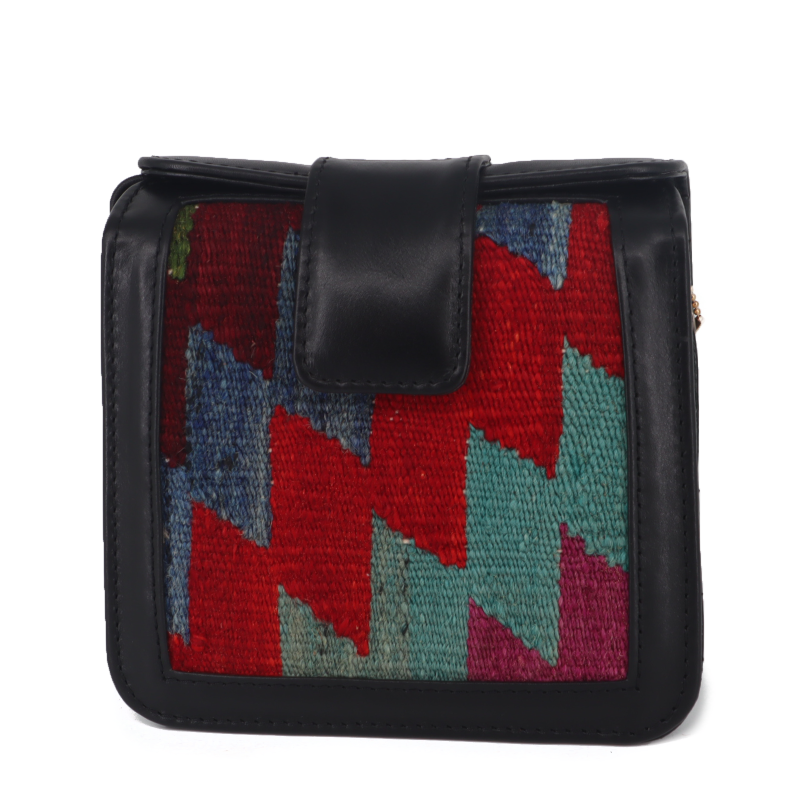 Handcrafted from a vintage kilim rug and finished with vegetable-tanned full-grain leather. The bag features a comfortable shoulder strap, reliable magnetic opening, and sturdy brass hardware. The interior is lined with a cotton canvas and includes a leather trimmed zip pocket and an additional zip interior pocket for all your essentials.