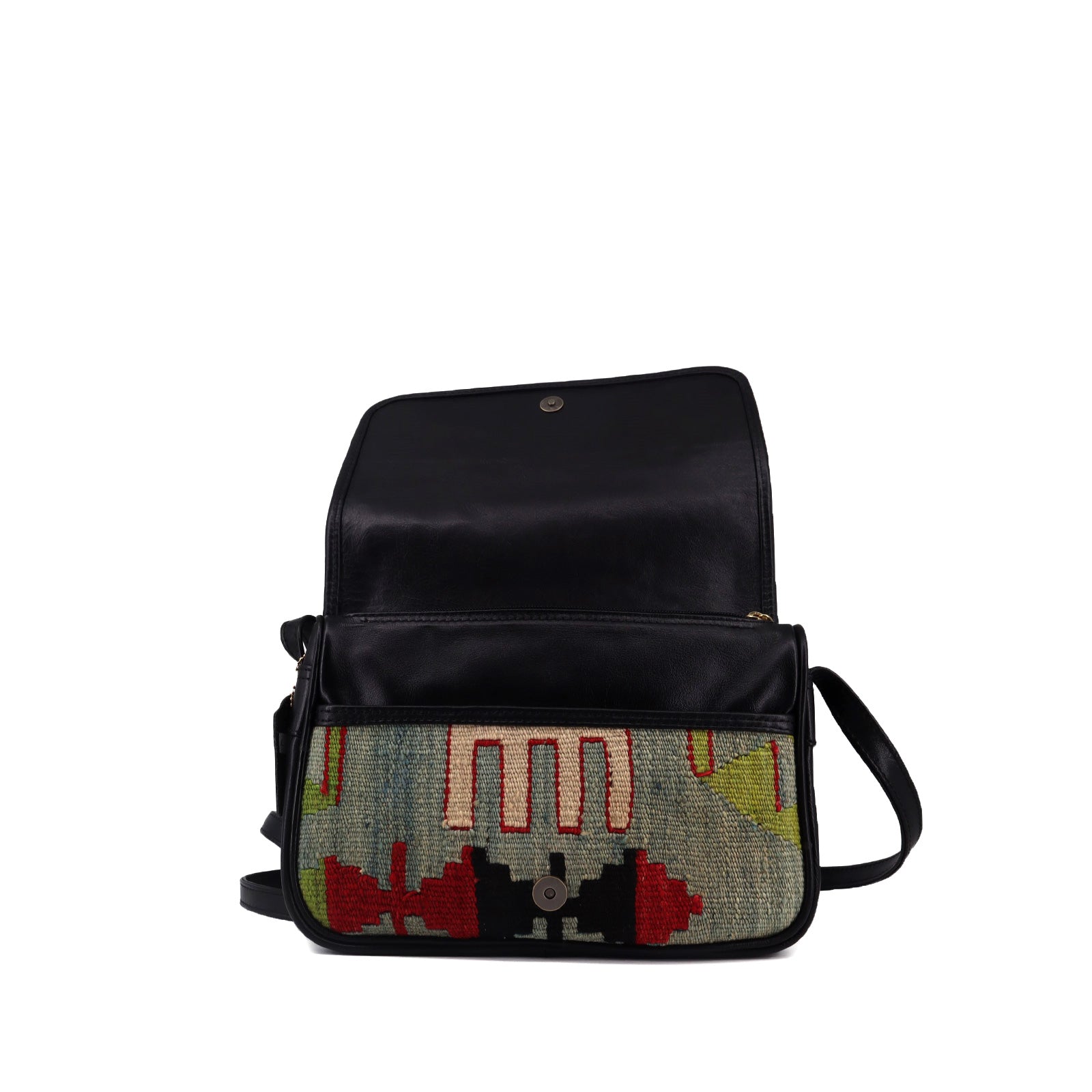 Handcrafted from a vintage kilim rug and finished with vegetable-tanned full-grain leather, our Crossbody Bag features a comfortable shoulder strap for easy carrying. The bag opens with a reliable magnetic opening, includes a zip interior pocket and stunning brass hardware.