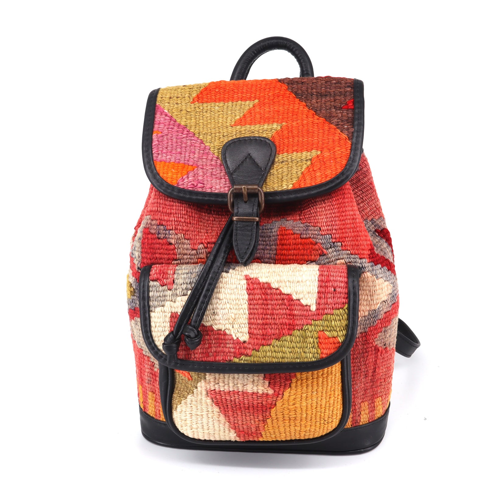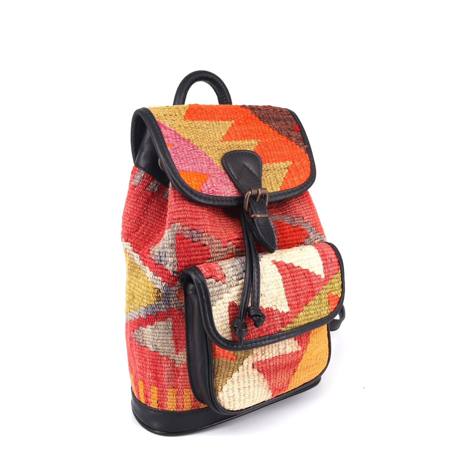 Handcrafted from a vintage kilim rug and finished with vegetable-tanned full-grain leather. The backpack features a leather handle and brass hardware. The bag opens to reveal a cotton canvas interior with a leather trimmed zip pocket and an additional zip interior pocket for extra storage.