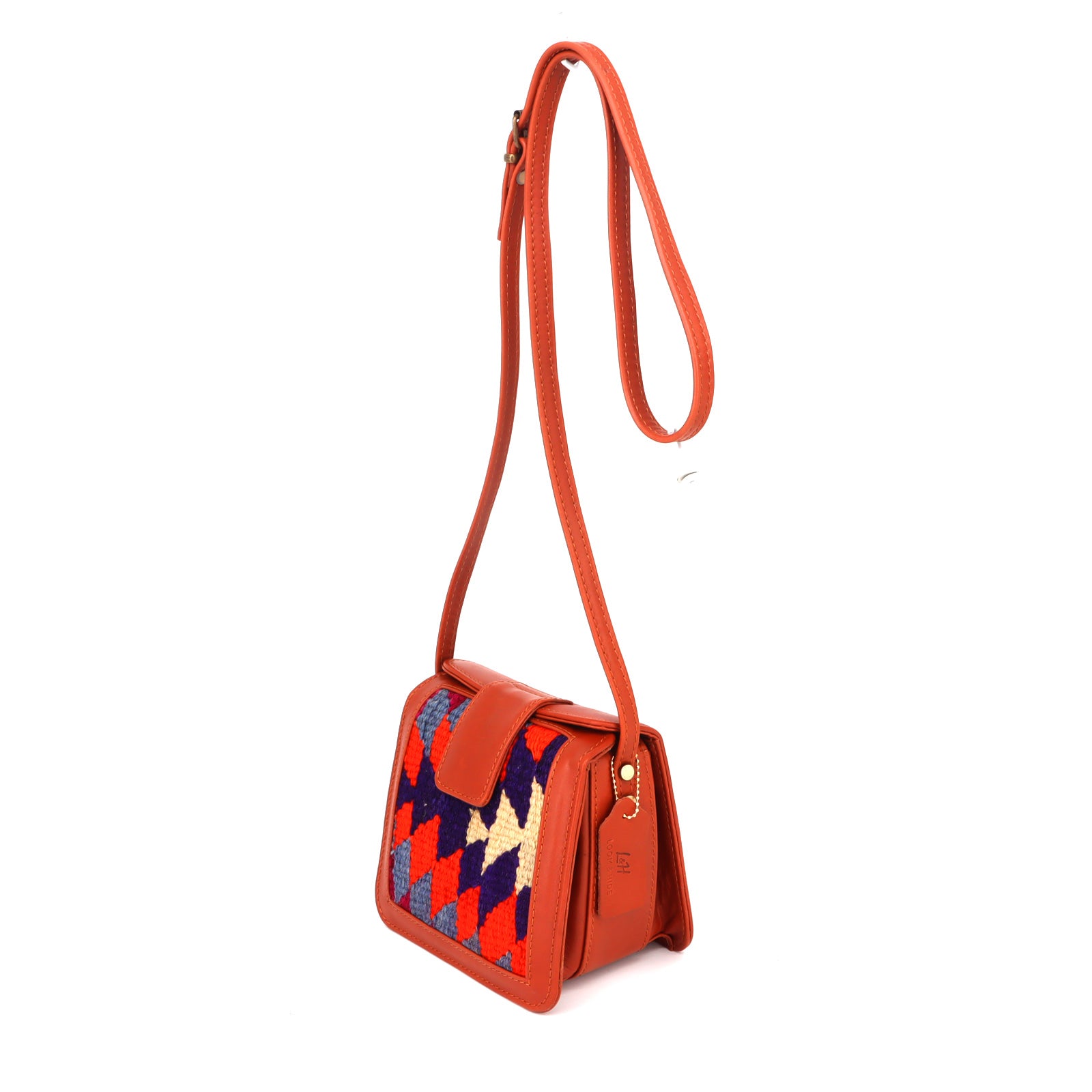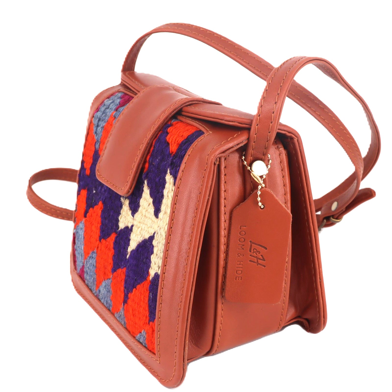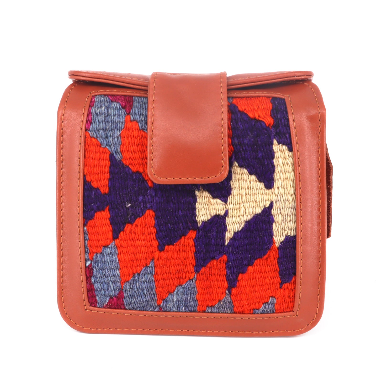 Handcrafted from a vintage kilim rug and finished with vegetable-tanned full-grain leather. This crossbody bag is designed with a shoulder strap for easy carrying, and magnetic opening for secure storage. The bag is adorned with brass hardware for a touch of elegance, and the interior is lined with a cotton canvas for added durability. Included are a leather trimmed zip pocket and additional zip interior pocket for organizing personal items.