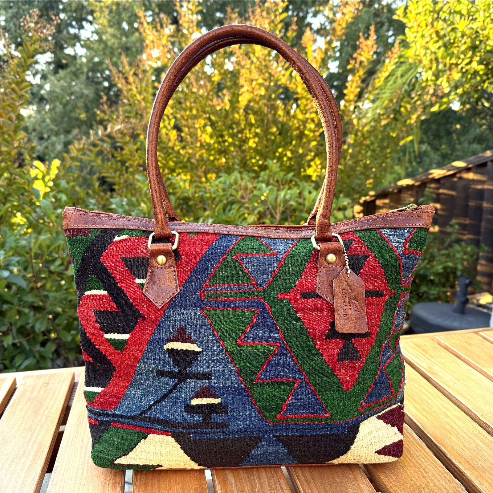The leather reinforces high-contact areas like straps, corners, and bases, while the woven kilim remains lightweight and flexible. The result is a bag that feels soft but sturdy, able to handle daily use for years — even decades — without losing its shape or charm.