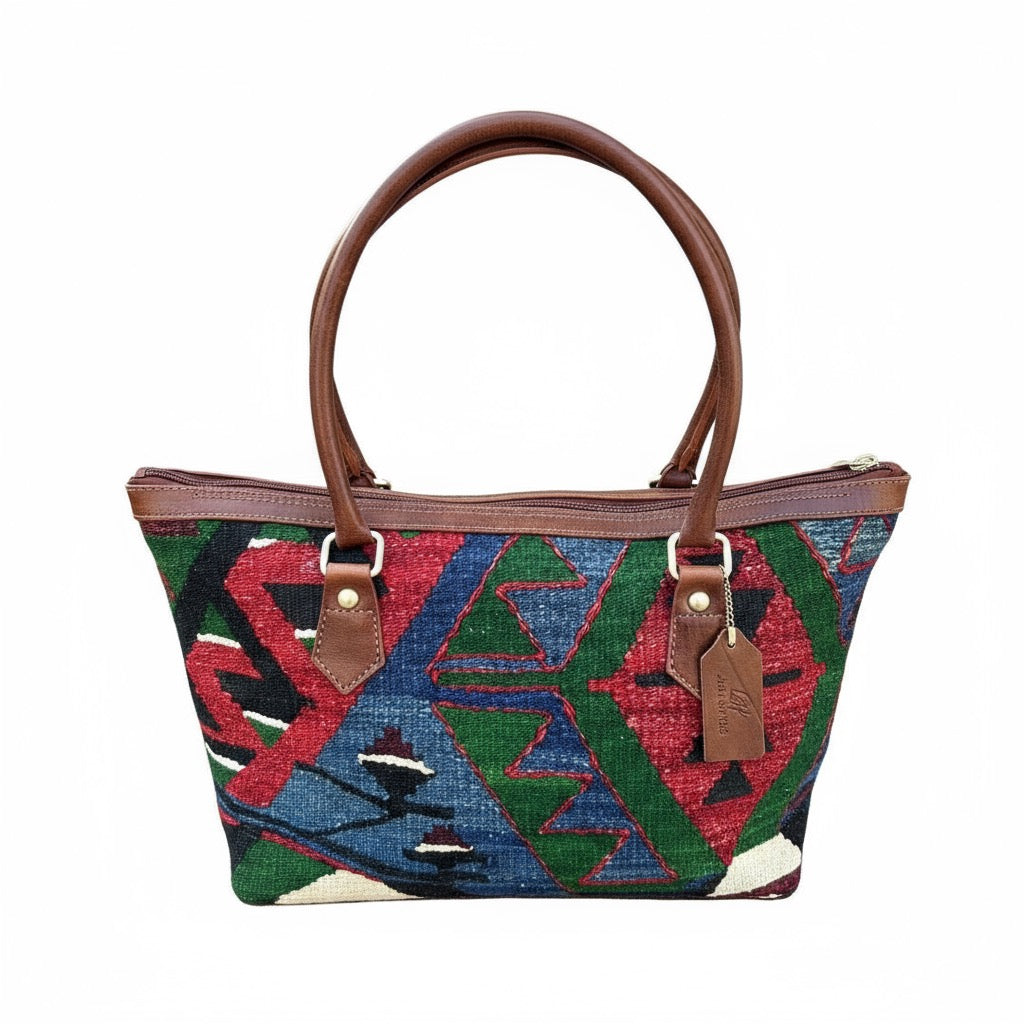 Our artisans study each pattern before cutting, ensuring that no two bags share the same layout or colors. The kilim is then combined with full-grain, vegetable-tanned leather — the most durable and natural form of leather — and finished entirely by hand.