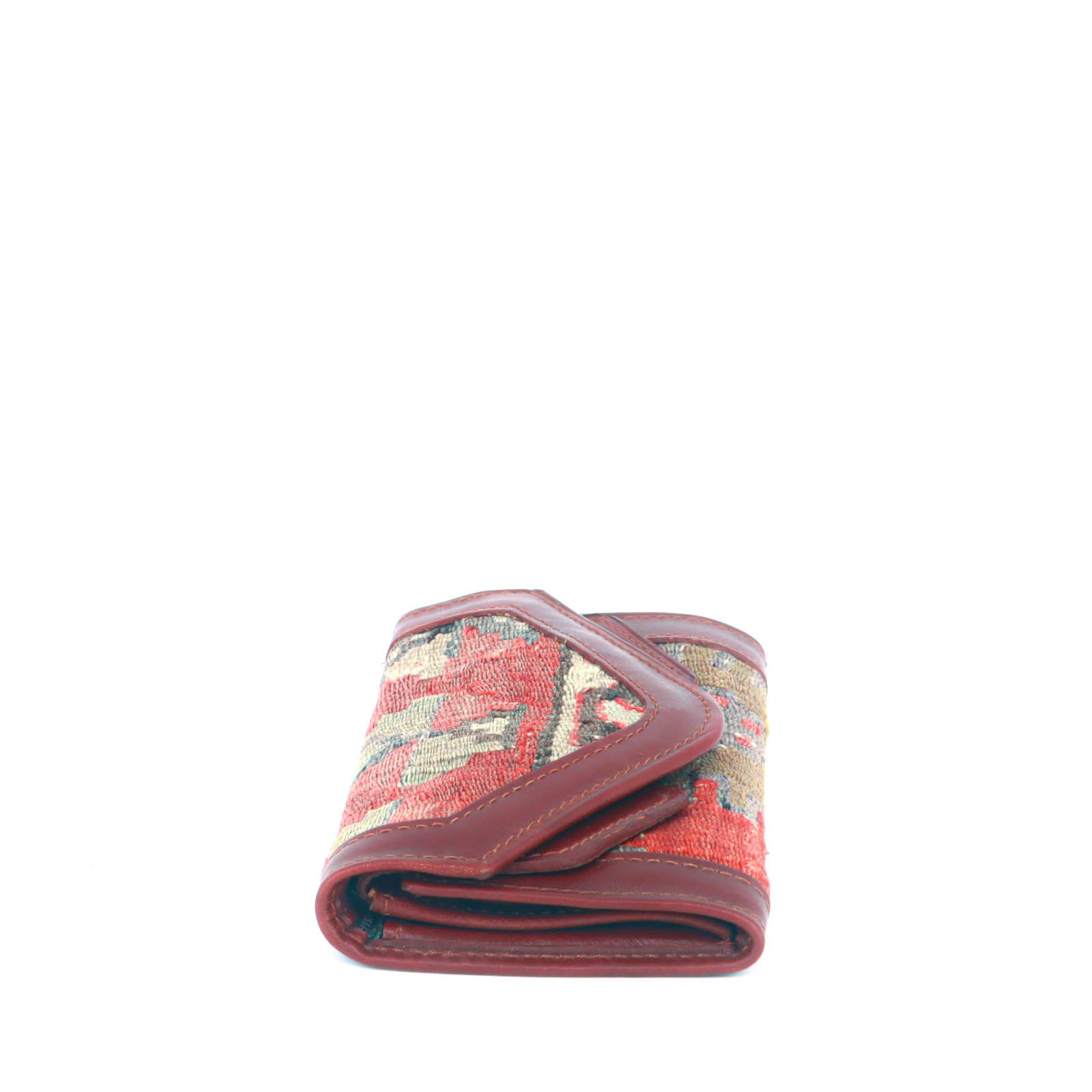 Handcrafted from a vintage kilim rug and finished with vegetable-tanned full-grain leather, our clutch wallet is a unique fusion of style and functionality. The wallet a convenient magnetic opening for secure closure. Its brass hardware adds a touch of sophistication, matching perfectly with the naturally dyed rug exterior.