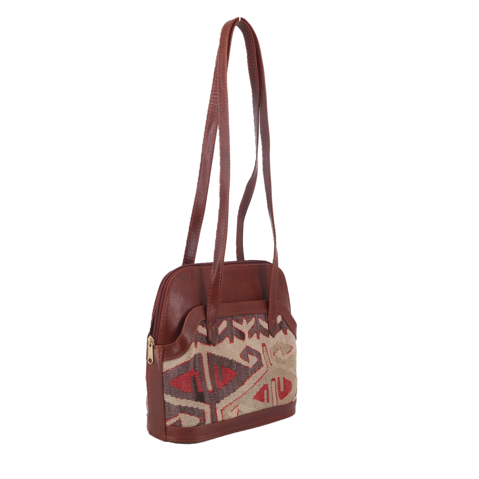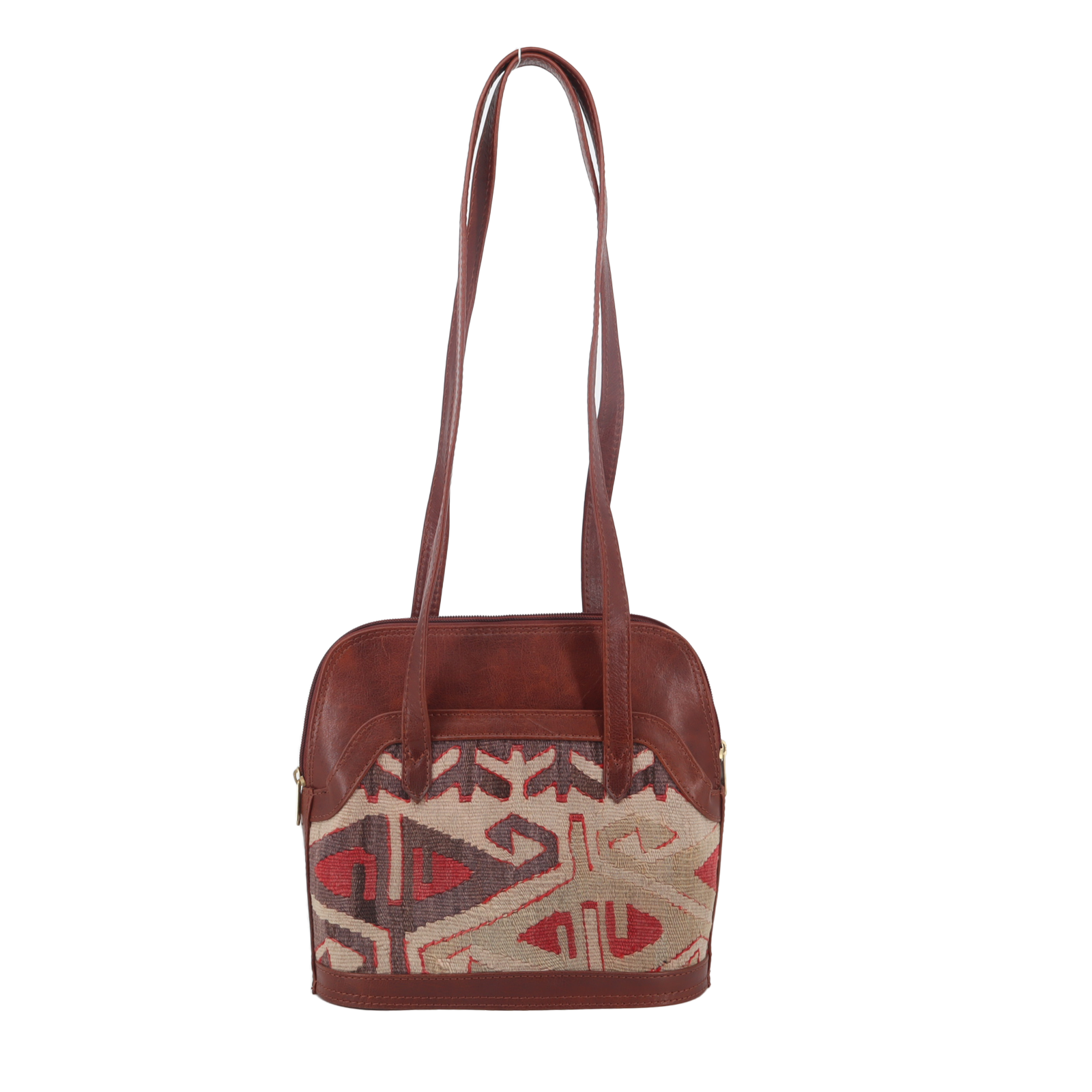 Handcrafted from a vintage kilim rug and finished with vegetable-tanned full-grain leather, this shoulder bag features a sturdy leather handle for comfortable carrying and a shoulder strap for versatile wear. The bag opens and closes with a reliable YKK zipper and magnetic opening. The interior, lined with cotton canvas, contains a zip pocket trimmed in leather for secure storage. Brass hardware adds a touch of rugged elegance.