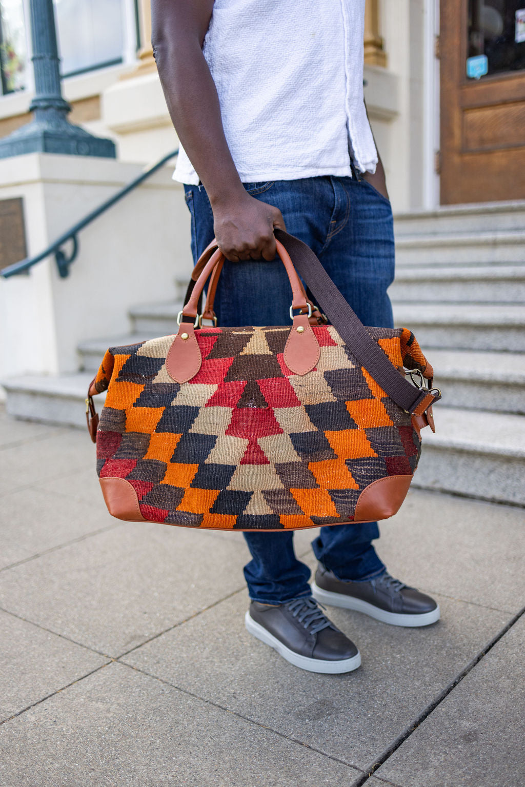 Each piece is made from a unique, hand-woven rug, so no one else will ever own the same bag.