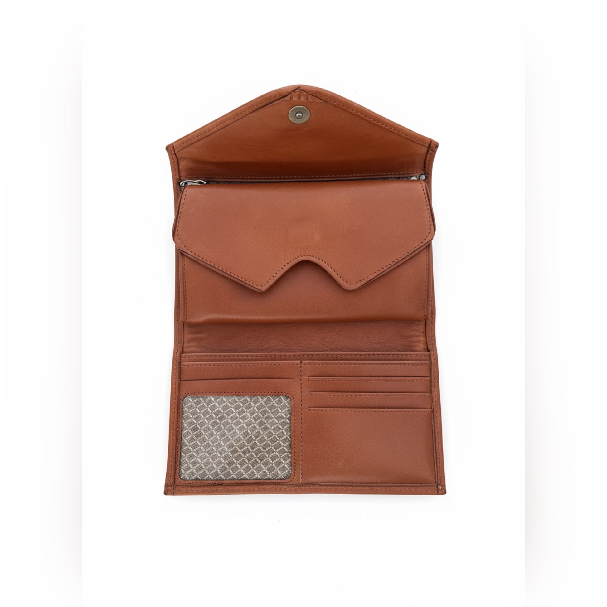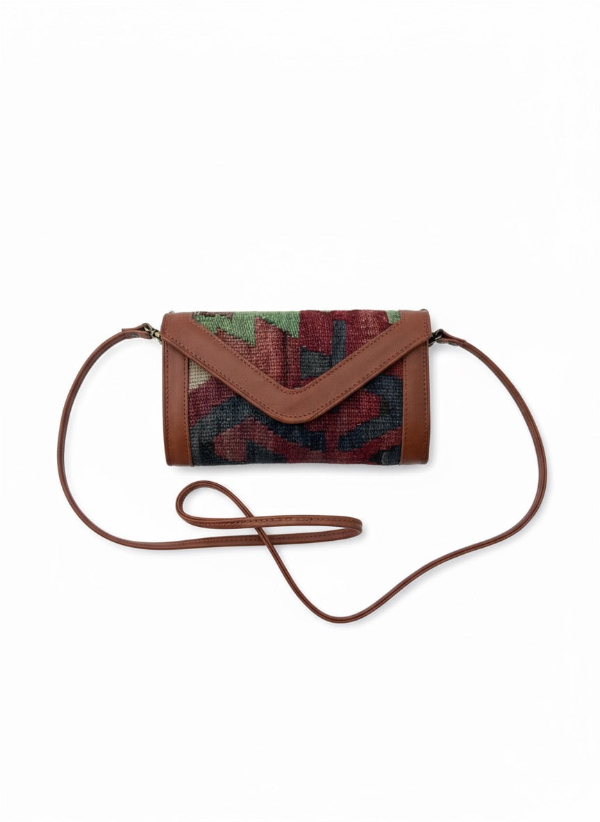 Nuru Kilim Clutch.Handcrafted from a vintage kilim rug and finished with vegetable-tanned full-grain leather, this clutch bag features a comfortable leather shoulder strap. It opens with a reliable magnetic opening and reveals a durable cotton canvas interior. Inside, you'll find a leather trimmed zip pocket and an additional zip interior pocket for your smaller essentials.