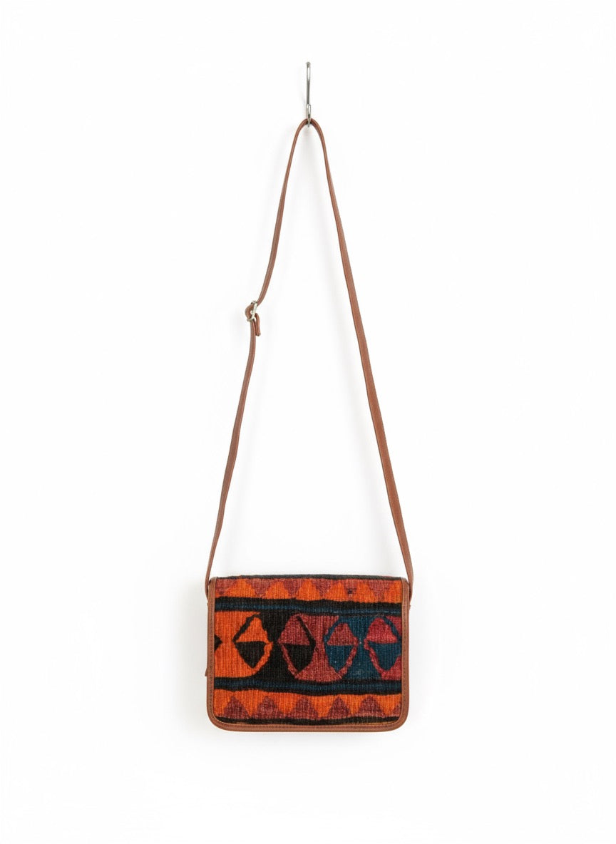 Handcrafted from a vintage kilim rug and finished with vegetable-tanned full-grain leather. This crossbody bag features a sturdy shoulder strap, a secure YKK zipper and magnetic opening with elegant brass hardware. The interior, lined with a durable cotton canvas, includes a leather-trimmed zip pocket and an additional zip interior pocket for your convenience.