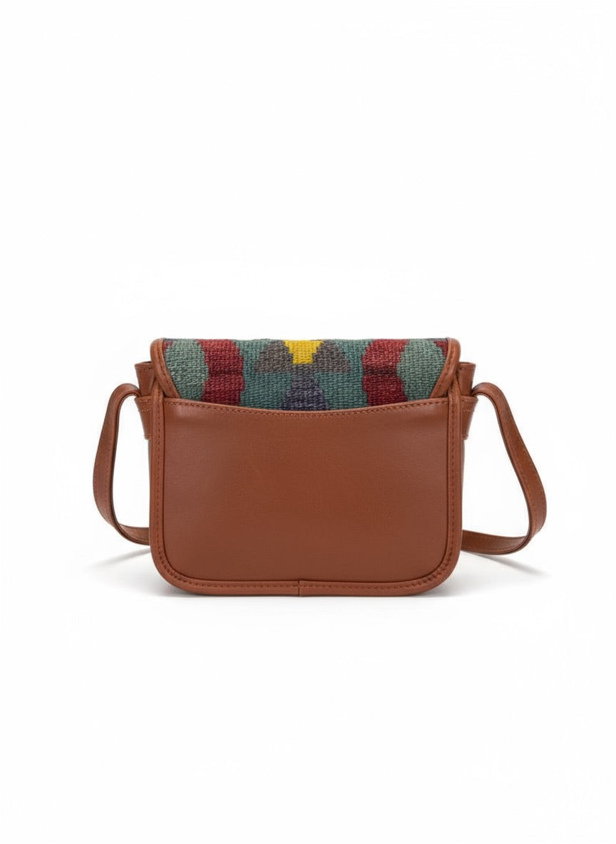 Handcrafted from a vintage kilim rug and finished with vegetable-tanned full-grain leather. This crossbody bag features a sturdy shoulder strap, a secure YKK zipper and magnetic opening with elegant brass hardware. The interior, lined with a durable cotton canvas, includes a leather-trimmed zip pocket and an additional zip interior pocket for your convenience.