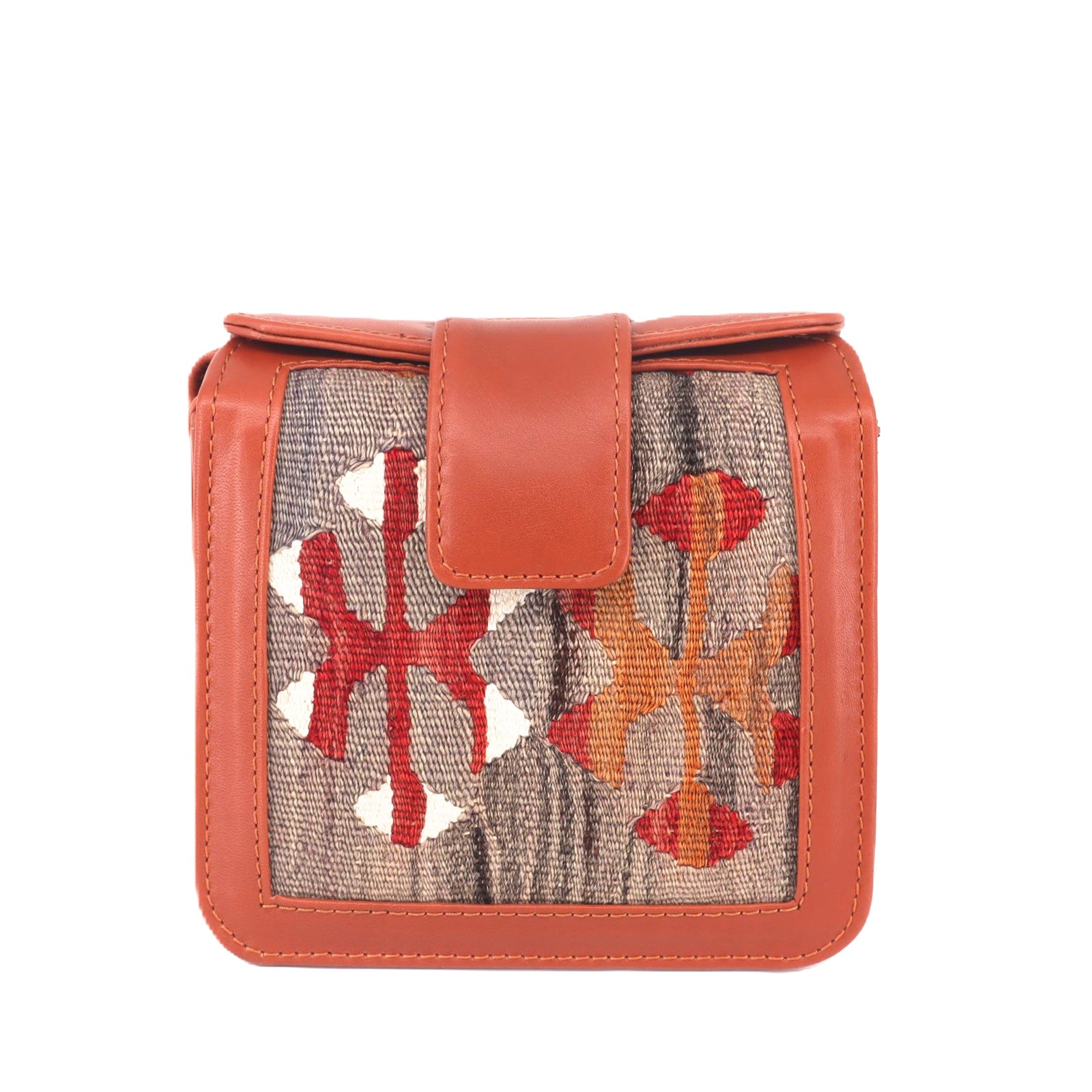 Handcrafted from a vintage kilim rug and finished with vegetable-tanned full-grain leather. The bag features a comfortable shoulder strap, reliable magnetic opening, and sturdy brass hardware. The interior is lined with a cotton canvas and includes a leather trimmed zip pocket and an additional zip interior pocket for all your essentials.