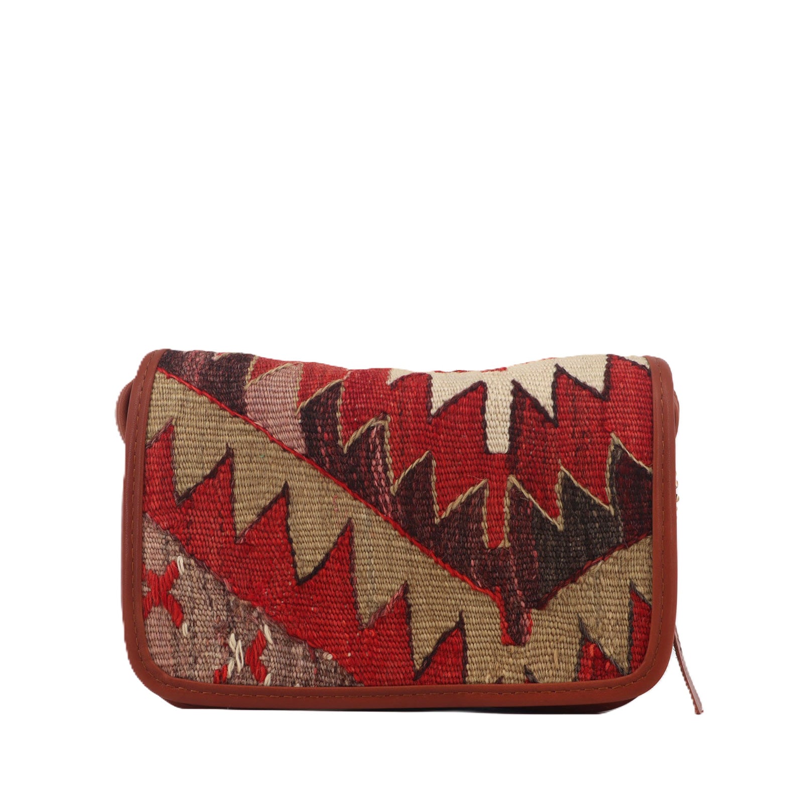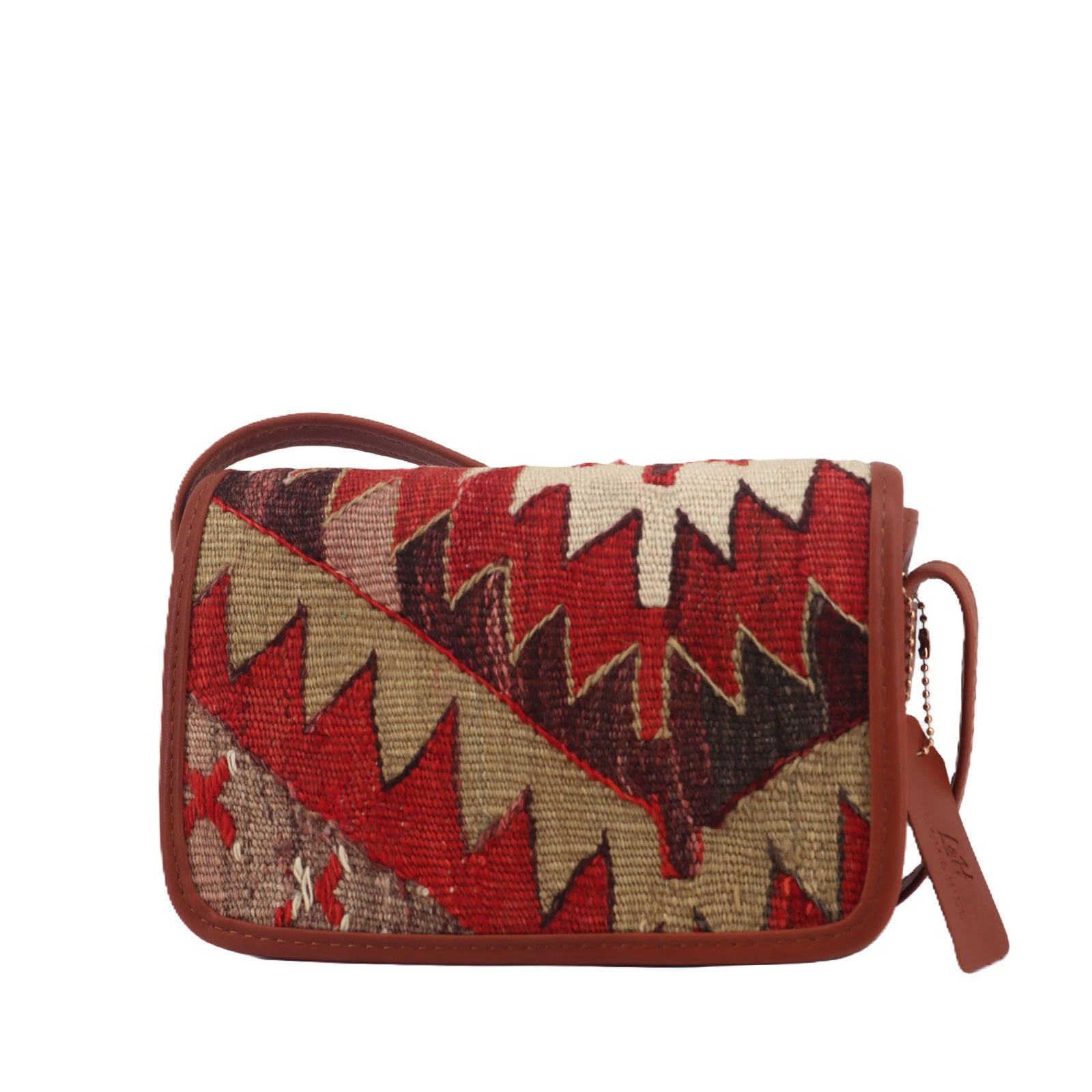 Handcrafted from a vintage kilim rug and finished with vegetable-tanned full-grain leather. This elegant crossbody bag features a shoulder strap, a magnetic opening for easy access. The bag is adorned with brass hardware, adding a rustic touch to its appearance. The interior is lined with cotton canvas and includes a zip pocket trimmed with leather, providing additional storage space.