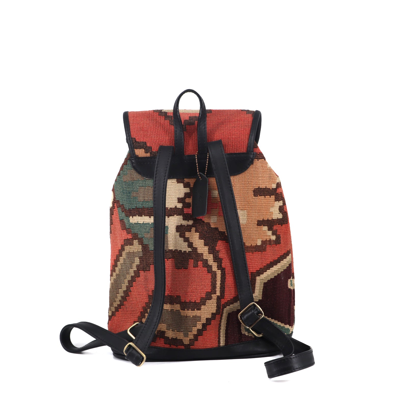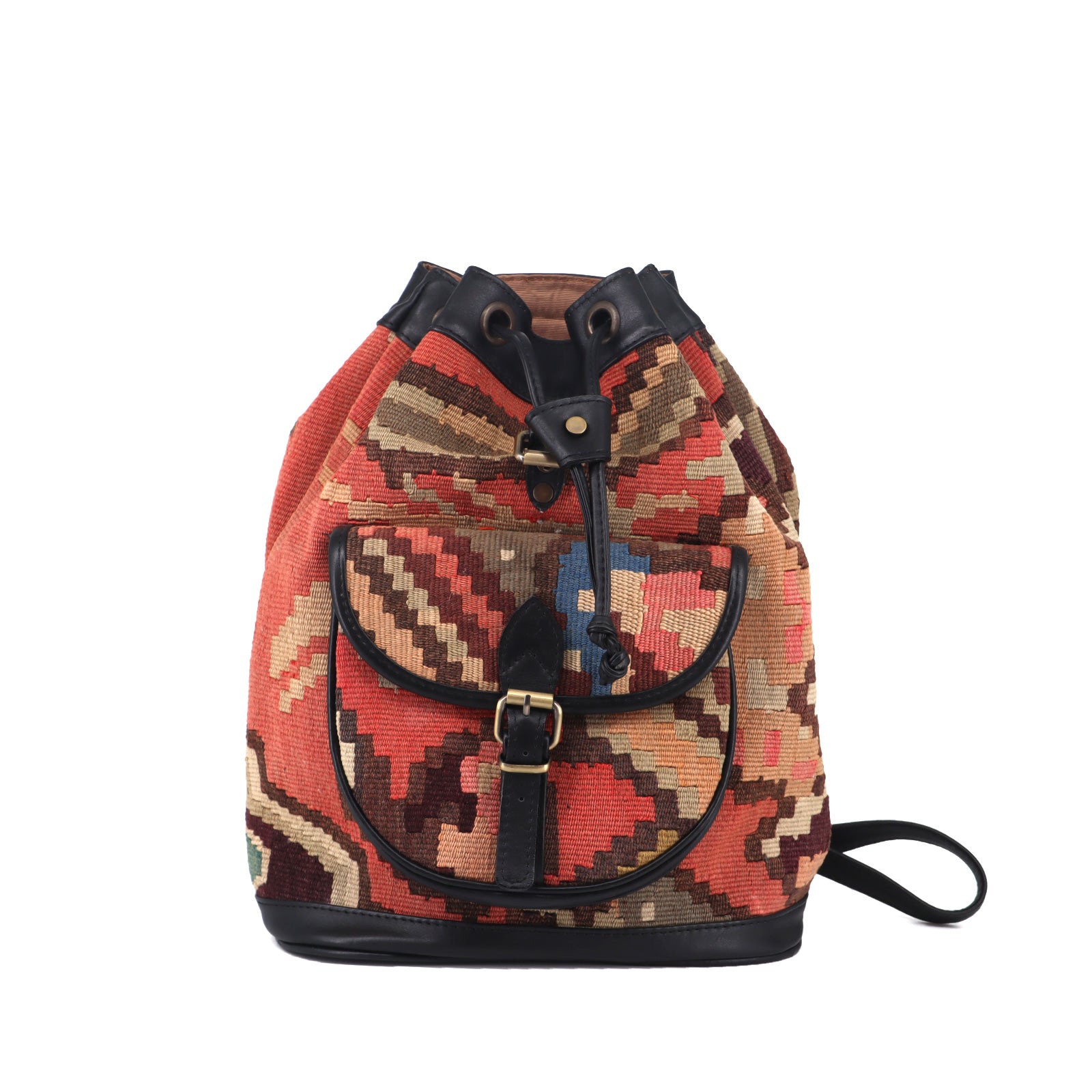 Handcrafted from a vintage kilim rug and finished with vegetable-tanned full-grain leather. This backpack bag comes with a leather handle and is equipped with brass hardware. The interior is lined with a cotton canvas and features a leather trimmed zip pocket and a zip interior pocket for additional storage.