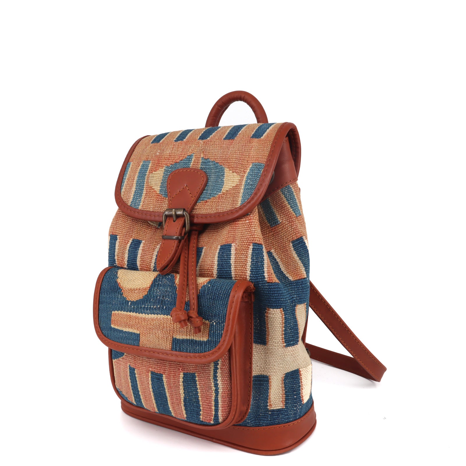 Handcrafted from a vintage kilim rug and finished with vegetable-tanned full-grain leather. This backpack features a sturdy leather handle and brass hardware, adding a touch of timeless elegance to its design.