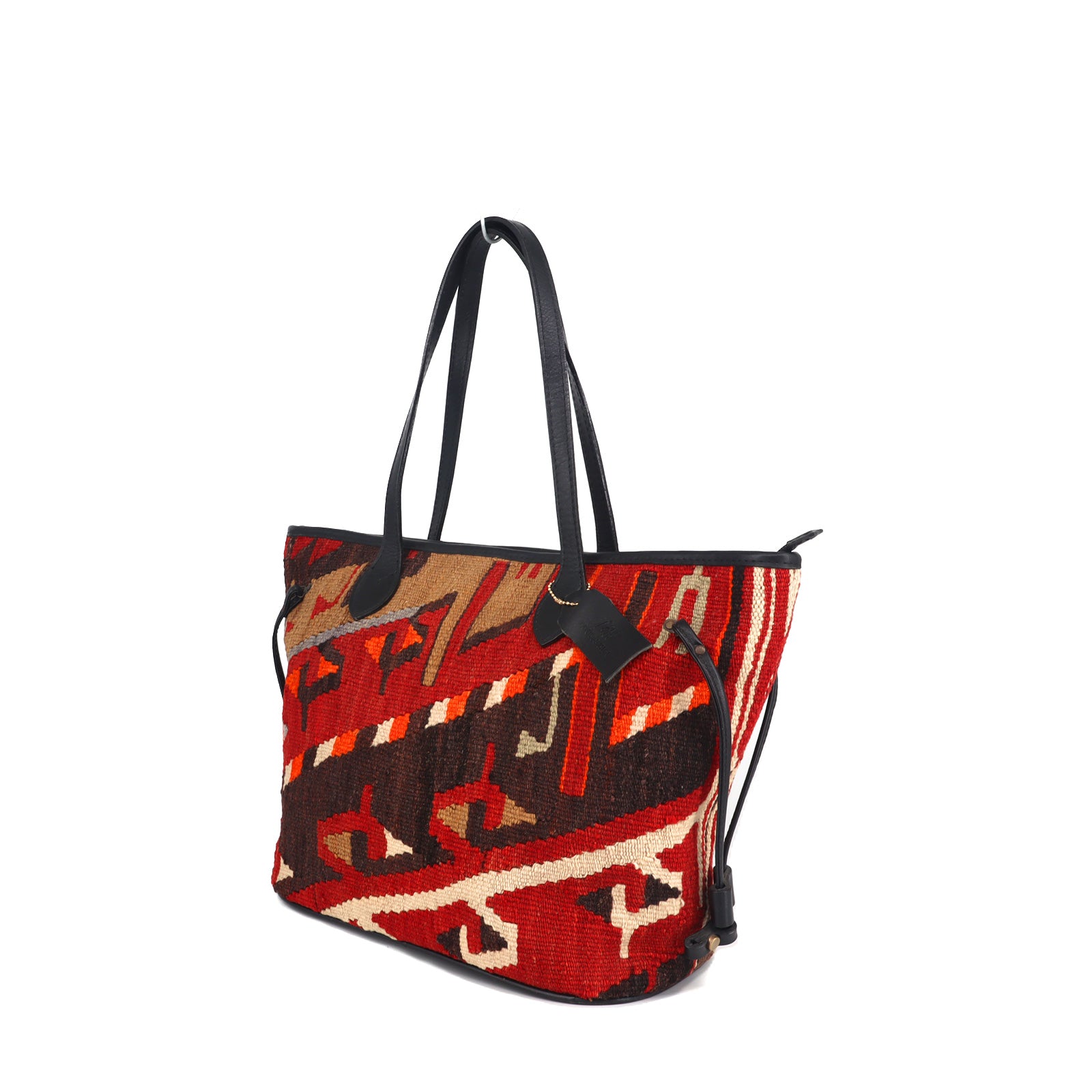 Handcrafted from a vintage kilim rug and finished with vegetable-tanned full-grain leather. This tote bag features a comfortable shoulder strap and a secure YKK zipper. The brass hardware adds a timeless appeal while the cotton canvas interior offers durable protection. The bag comes with a sturdy leather handle and a leather trimmed zip pocket for added convenience. The zip interior pocket makes it perfect for carrying your essentials.