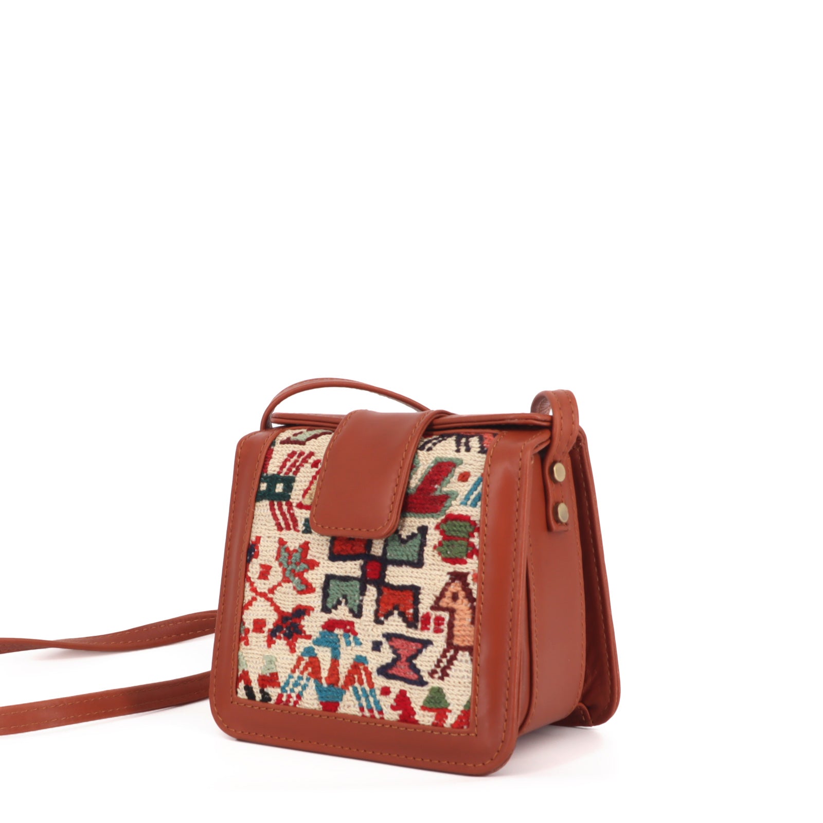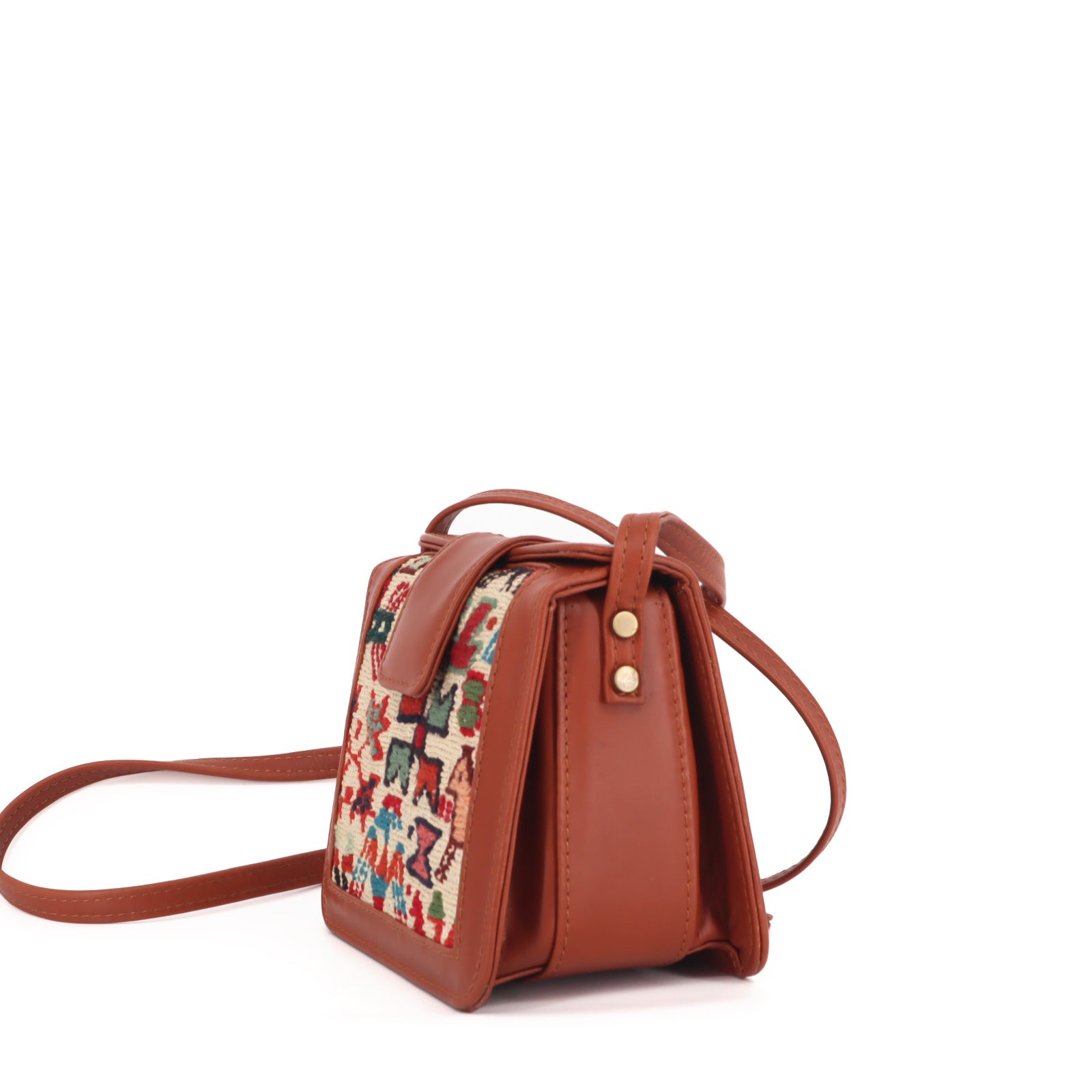 Each piece is one-of-a-kind, showcasing unique rug patterns and colors, making the Tiziri Sumak Crossbody Leather Bag not just a carry accessory, but a statement of your unique style.