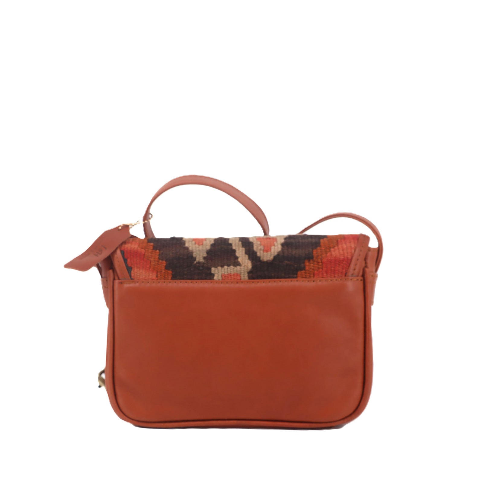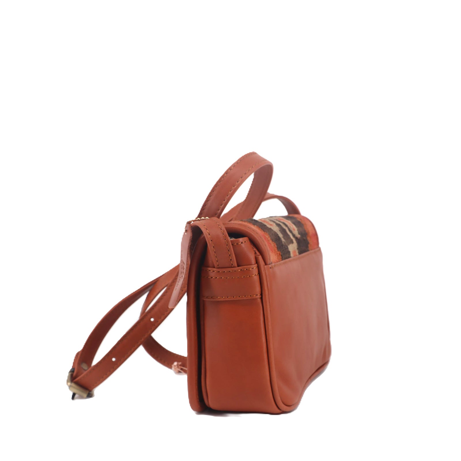 Handcrafted from a vintage kilim rug and finished with vegetable-tanned full-grain leather. This crossbody bag features a shoulder strap, a magnetic opening, brass hardware, a cotton canvas interior, a leather trimmed zip pocket, and a zip interior pocket for your convenience.