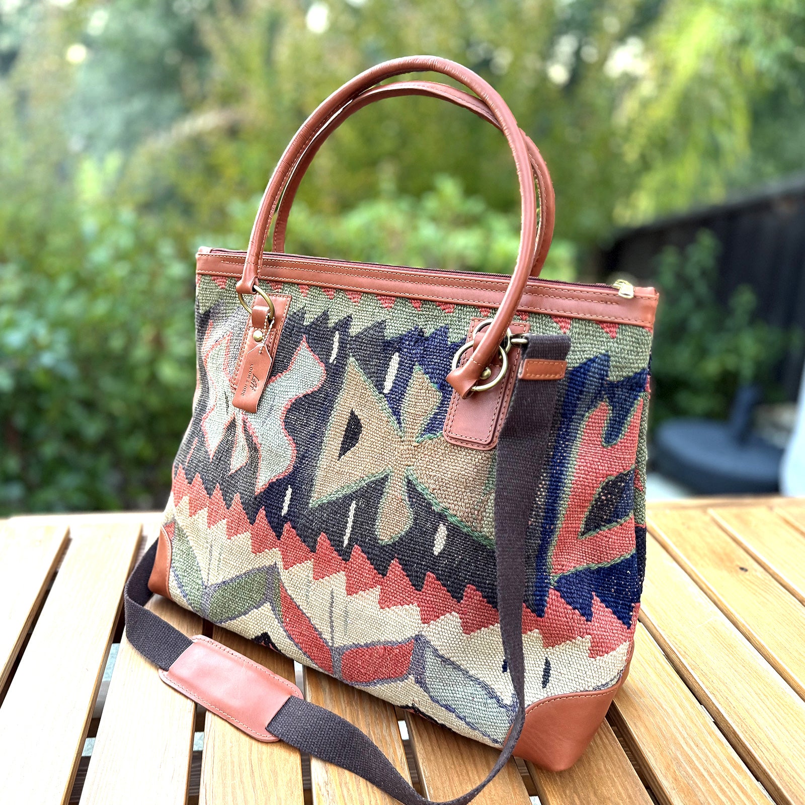 Even though they look substantial, our kilim and leather bags are lighter than most all-leather designs. The woven textile reduces weight while still offering incredible strength.