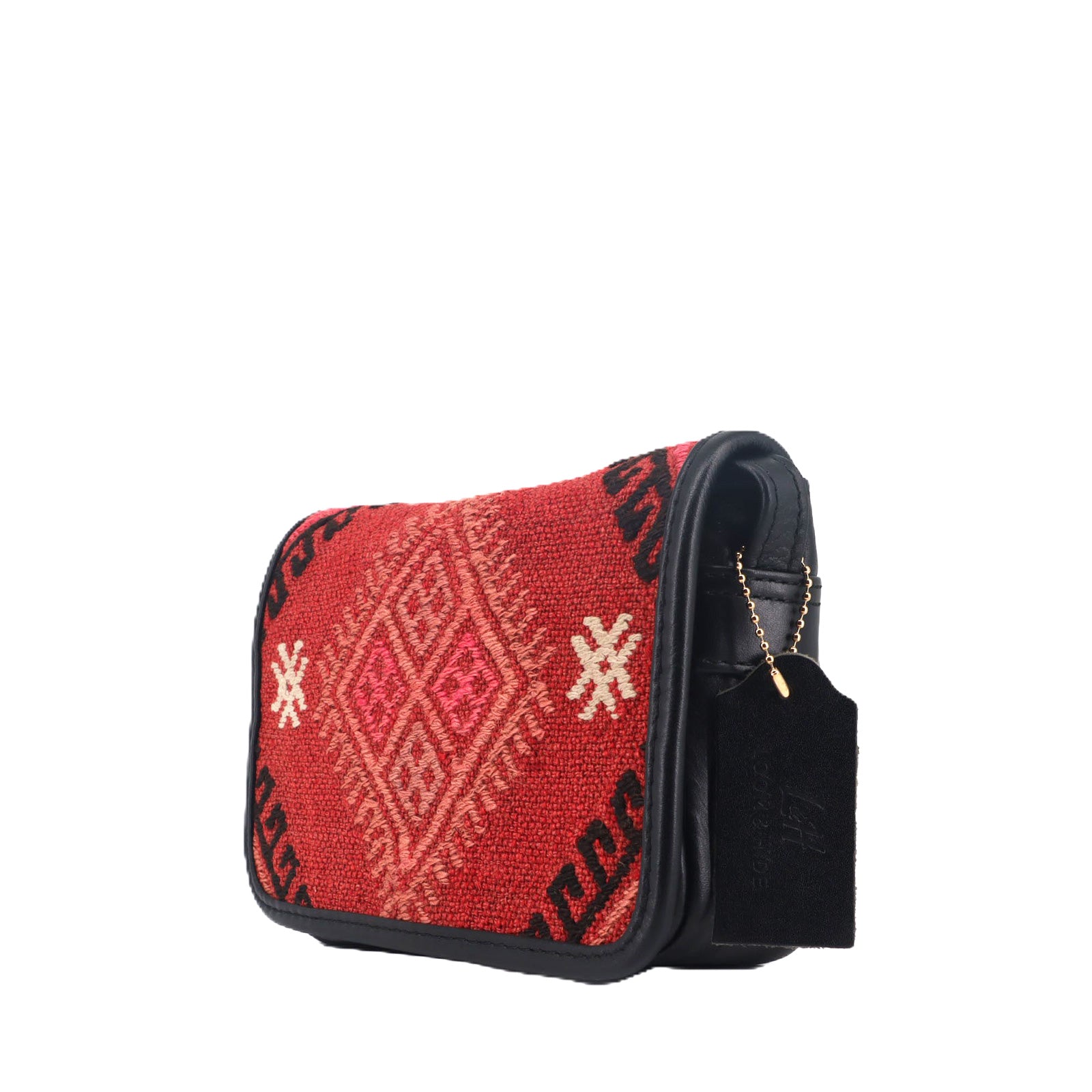 Handcrafted from a vintage kilim rug and finished with vegetable-tanned full-grain leather. This crossbody bag offers the perfect balance between style and function. It features a shoulder strap, a secure magnetic opening, and shining brass hardware. The bag's interior is lined with sturdy cotton canvas and includes a leather-trimmed zip pocket and an additional zip interior pocket for added convenience and organization.