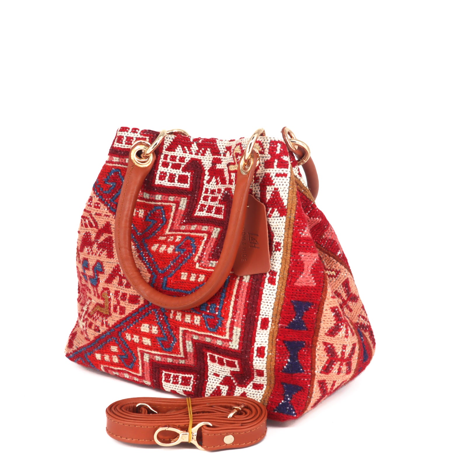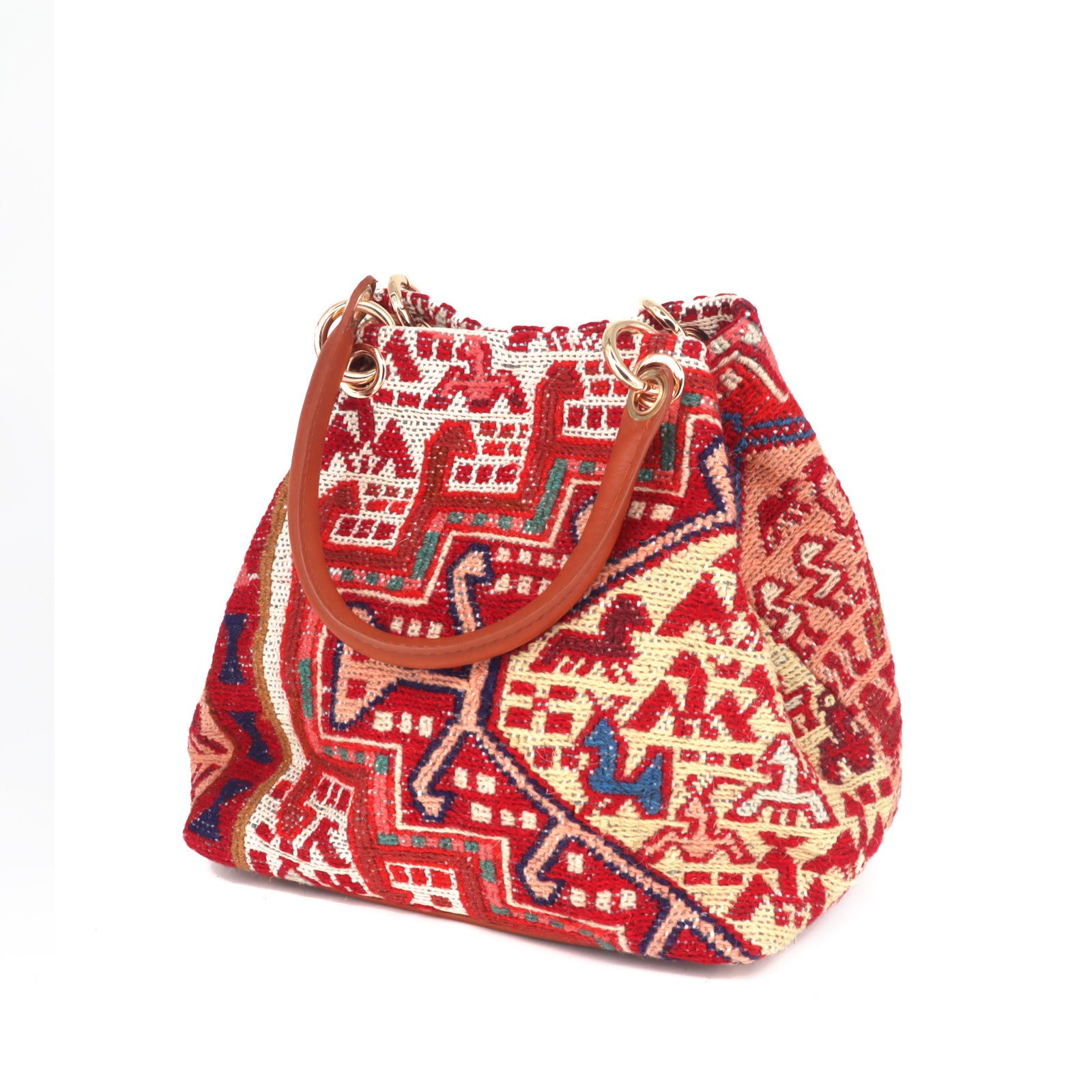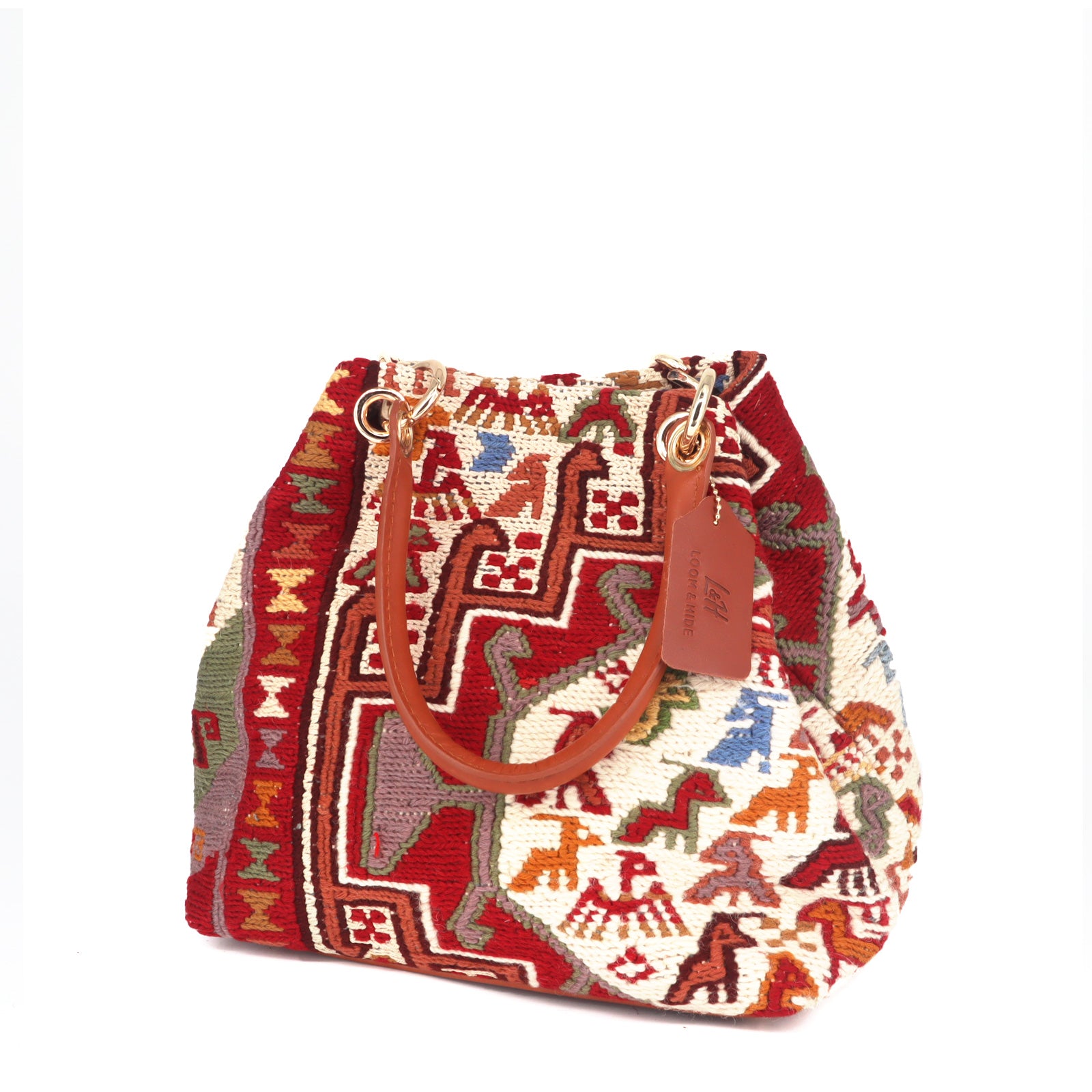 Each piece is one-of-a-kind, showcasing unique rug patterns and colors. This is a distinctive handmade bag with vibrant color combinations that make it truly unique.