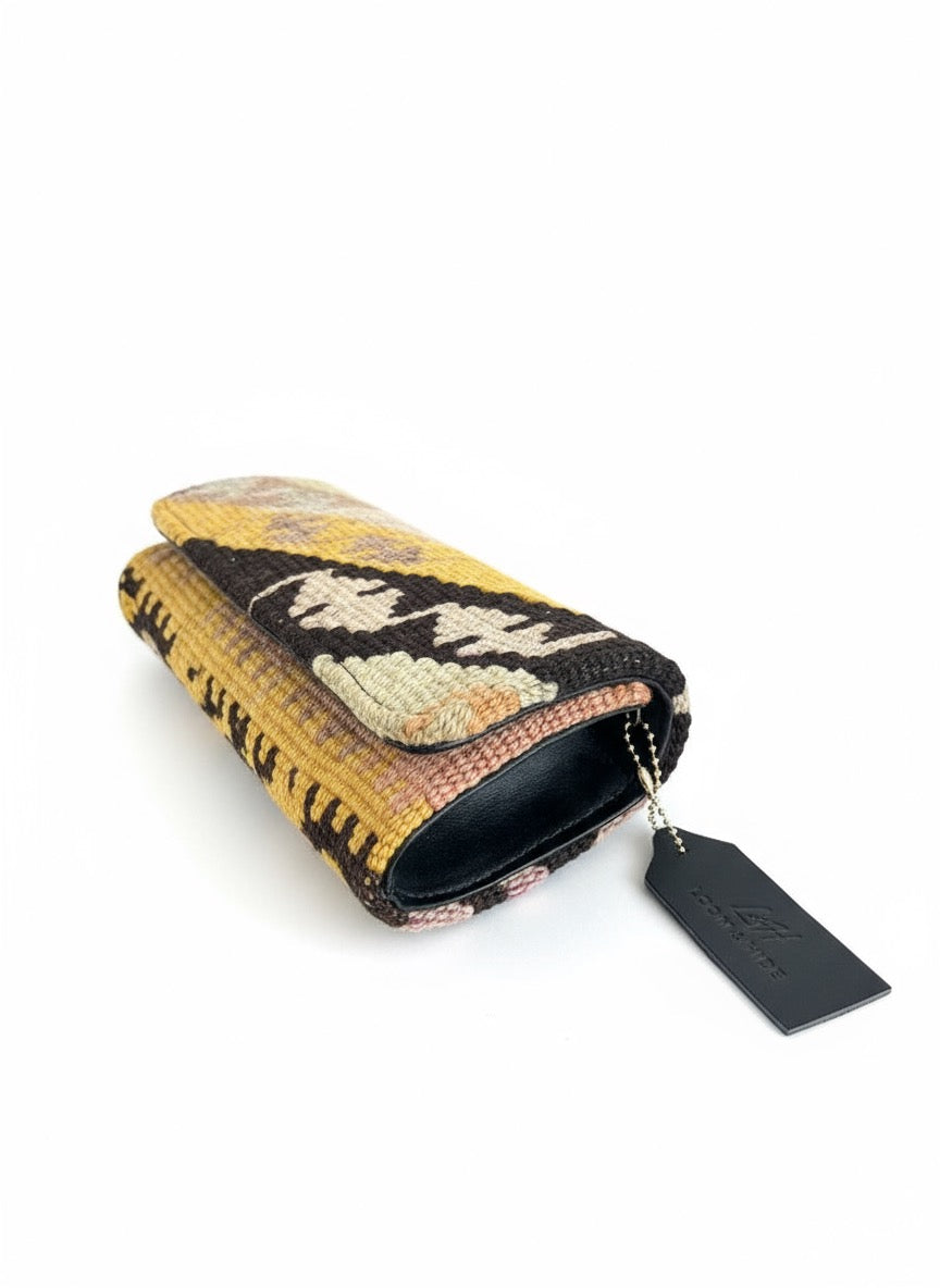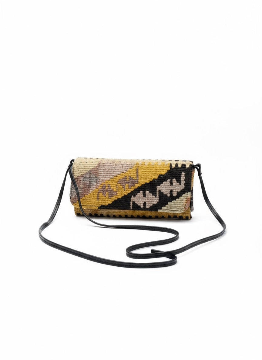 Handcrafted from a vintage kilim rug and finished with vegetable-tanned full-grain leather. This clutch bag features a sturdy leather shoulder strap for versatile carrying options. A magnetic opening secures the opening, complemented by brass hardware for a timeless touch. Inside, a cotton canvas interior houses a leather-trimmed zip pocket and additional zip interior pocket for organized storage.