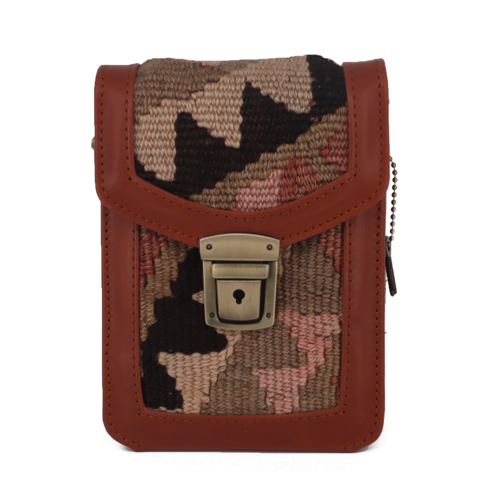 Handcrafted from a vintage kilim rug and finished with vegetable-tanned full-grain leather. This crossbody bag features a comfortable leather shoulder strap, a secure latch, and sleek brass hardware. The cotton canvas interior, along with a leather trimmed zip pocket offer ample storage and organization.