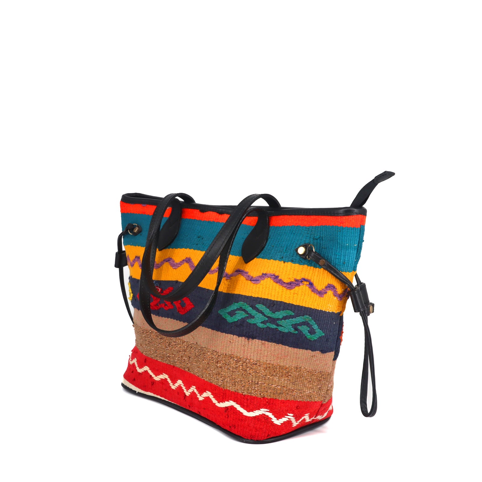 The leather reinforces high-contact areas like straps, corners, and bases, while the woven kilim remains lightweight and flexible. The result is a bag that feels soft but sturdy, able to handle daily use for years — even decades — without losing its shape or charm.