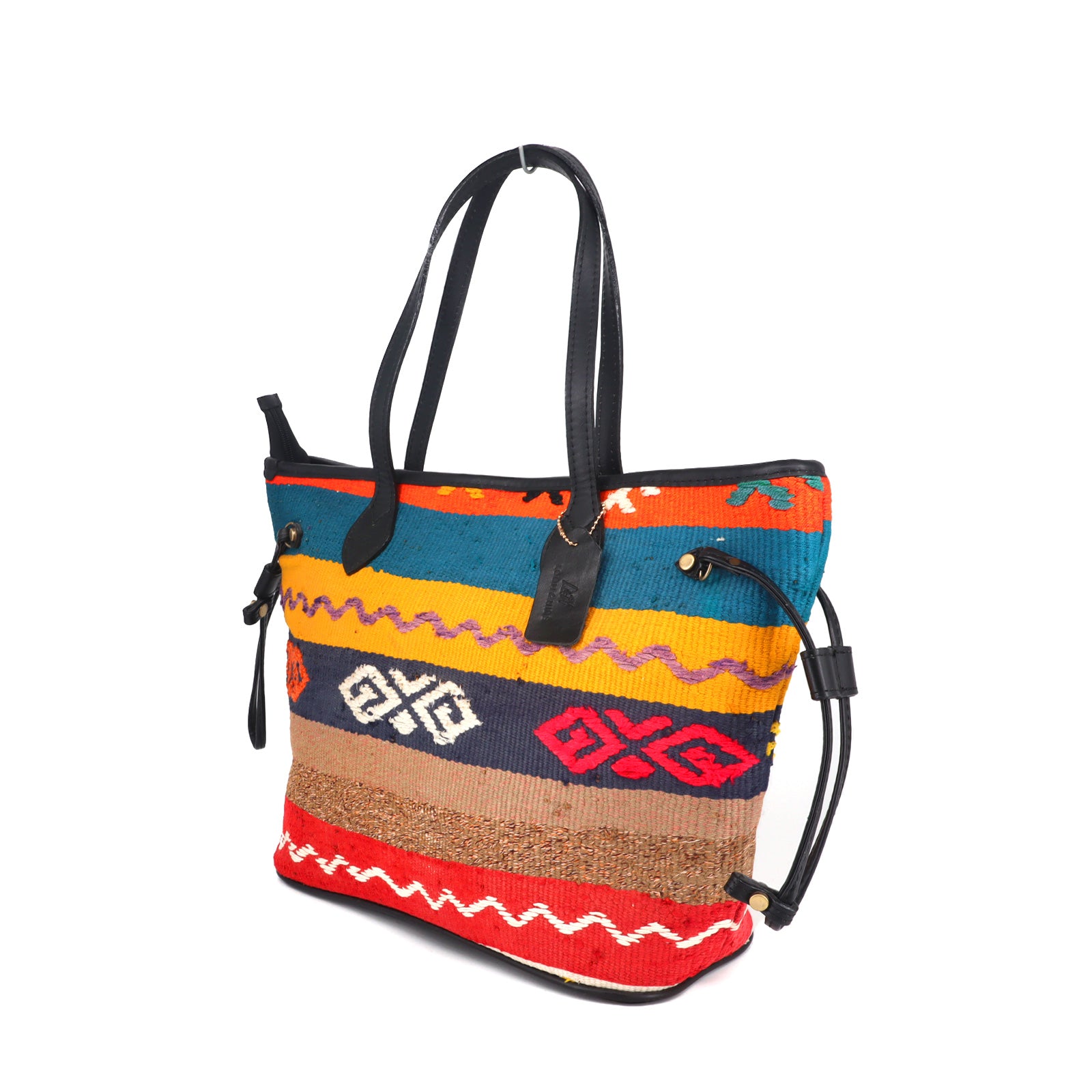 Each piece is one-of-a-kind, showcasing unique rug patterns and colors. With its distinctive earth-tone palette, this tote bag is truly a unique piece of art.