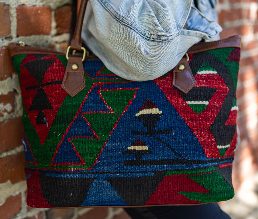 Even though they look substantial, our kilim and leather bags are lighter than most all-leather designs. The woven textile reduces weight while still offering incredible strength.