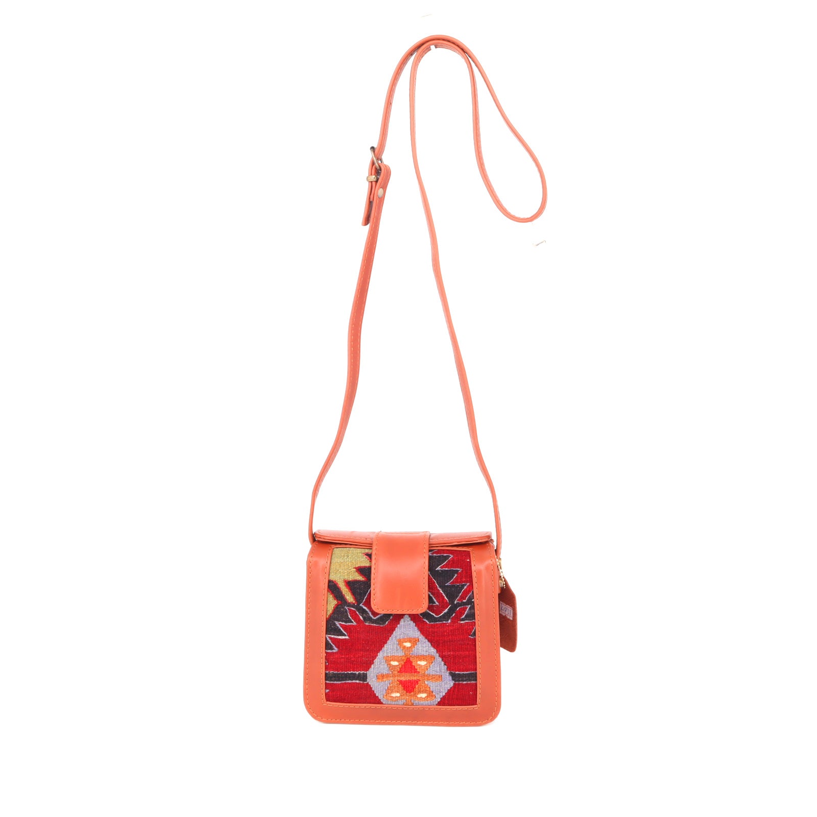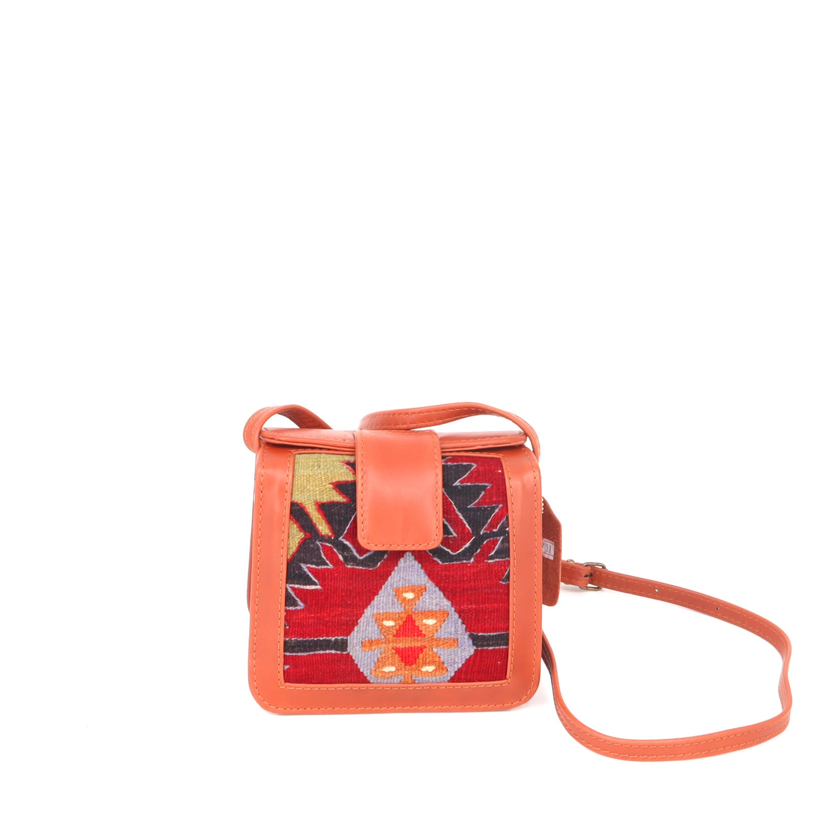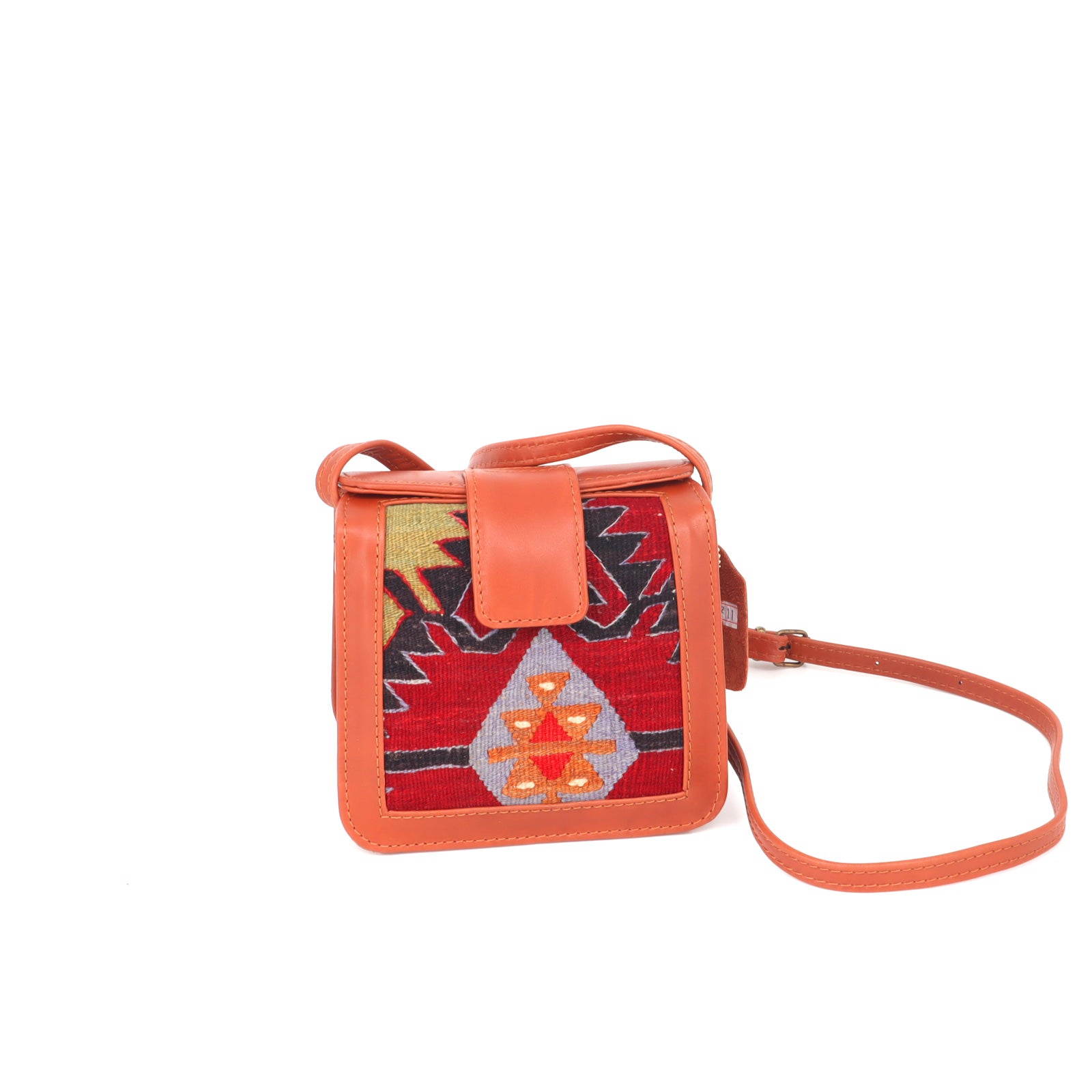 Handcrafted from a vintage kilim rug and finished with vegetable-tanned full-grain leather. The bag features a comfortable shoulder strap, reliable magnetic opening, and sturdy brass hardware. The interior is lined with a cotton canvas and includes a leather trimmed zip pocket and an additional zip interior pocket for all your essentials.