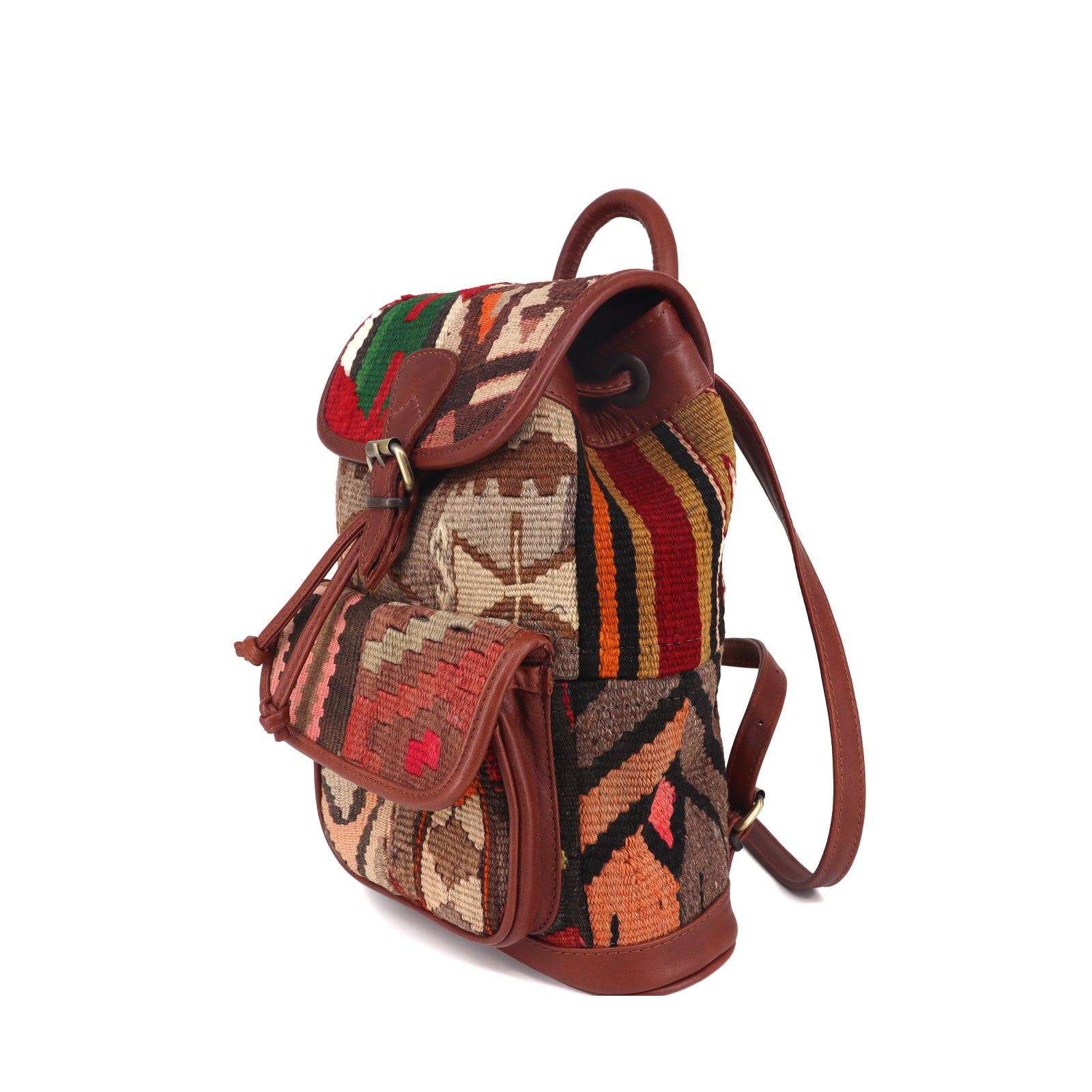 Handcrafted from a vintage kilim rug and finished with vegetable-tanned full-grain leather. This unique backpack features a sturdy leather handle, brass hardware and a zippered interior pocket trimmed in leather. The interior is lined with durable cotton canvas, providing additional strength and longevity.