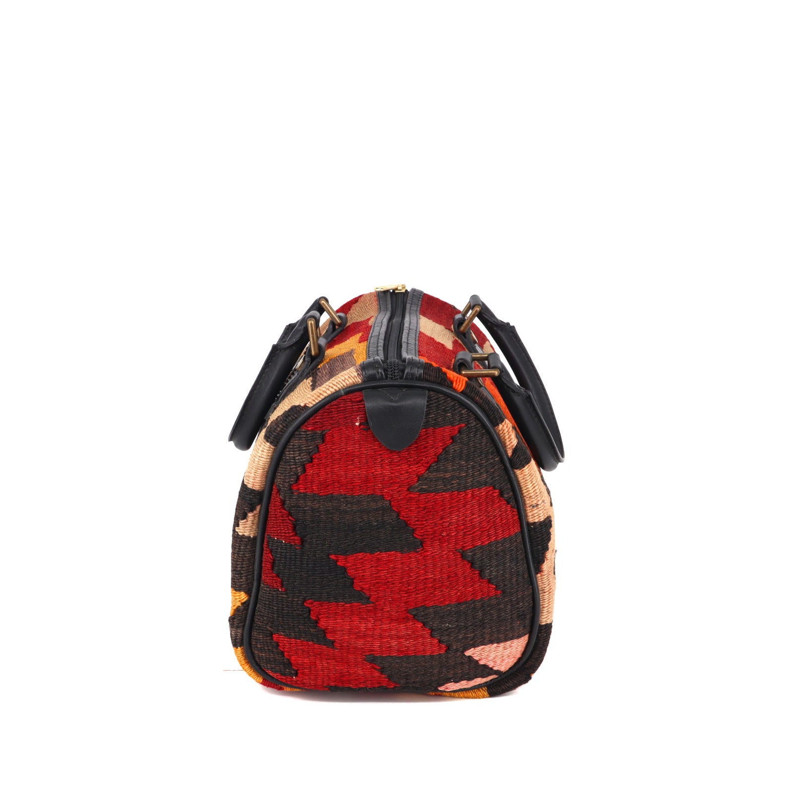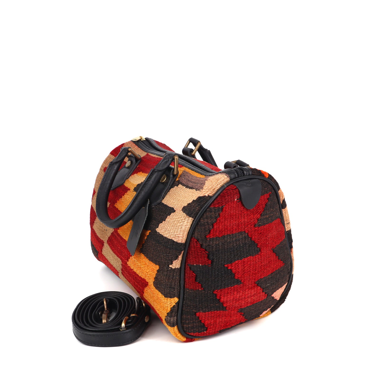 Handcrafted from a vintage kilim rug and finished with vegetable-tanned full-grain leather, this exquisite duffle bag comes with a sturdy leather handle and a comfortable shoulder strap. The bag is equipped with a reliable YKK zipper for easy access and safeguarding your essentials.