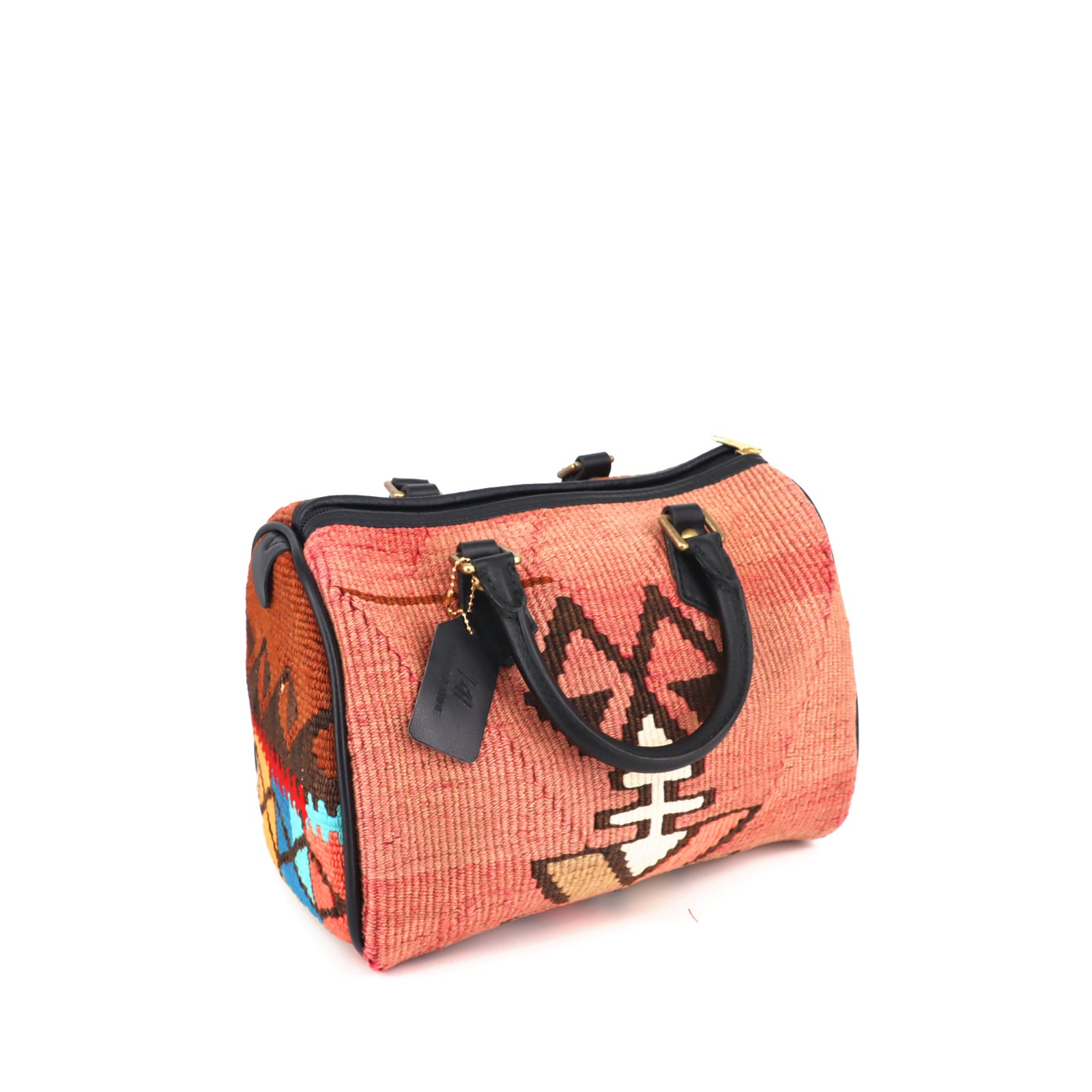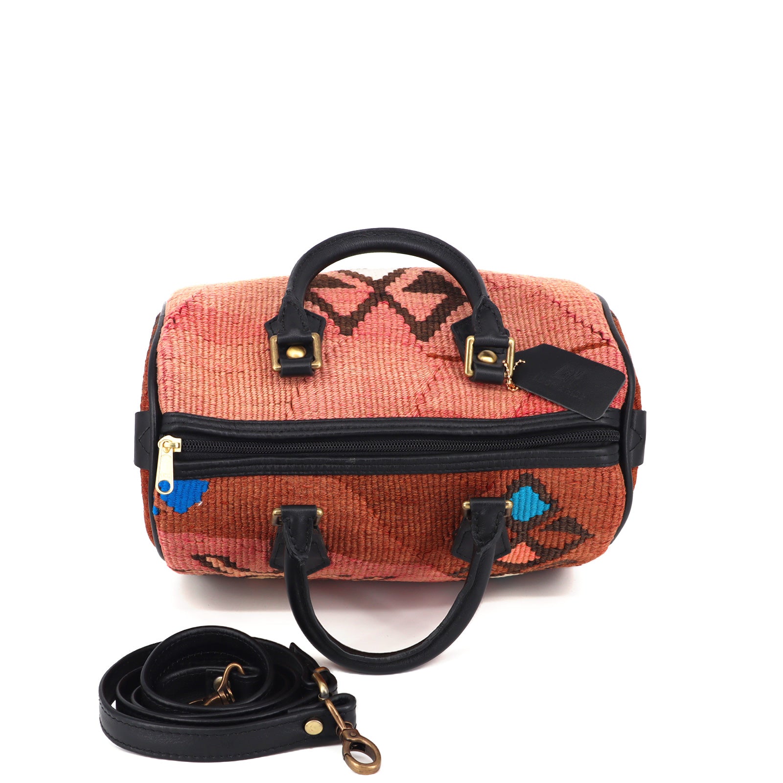 Handcrafted from a vintage kilim rug and finished with vegetable-tanned full-grain leather. This duffle bag features a comfortable shoulder strap, a sturdy YKK zipper, and sleek brass hardware. The interior, lined with cotton canvas, is equipped with a leather trimmed zip pocket and an additional zip interior pocket for organized storage.