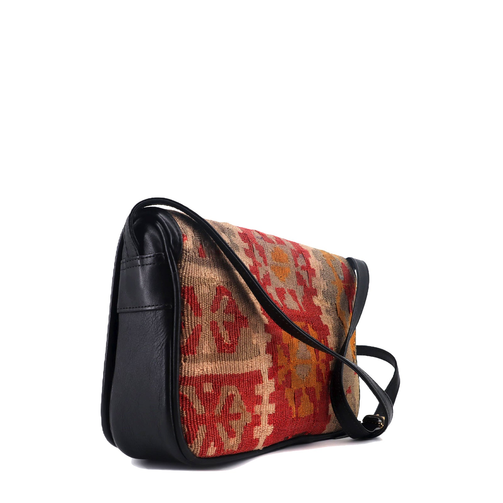 Handcrafted from a vintage kilim rug and finished with vegetable-tanned full-grain leather. This crossbody bag features a sturdy shoulder strap, a reliable a magnetic opening, and brass hardware. The interior is lined with a cotton canvas and includes a zip pocket trimmed in leather for added sophistication and functionality.
